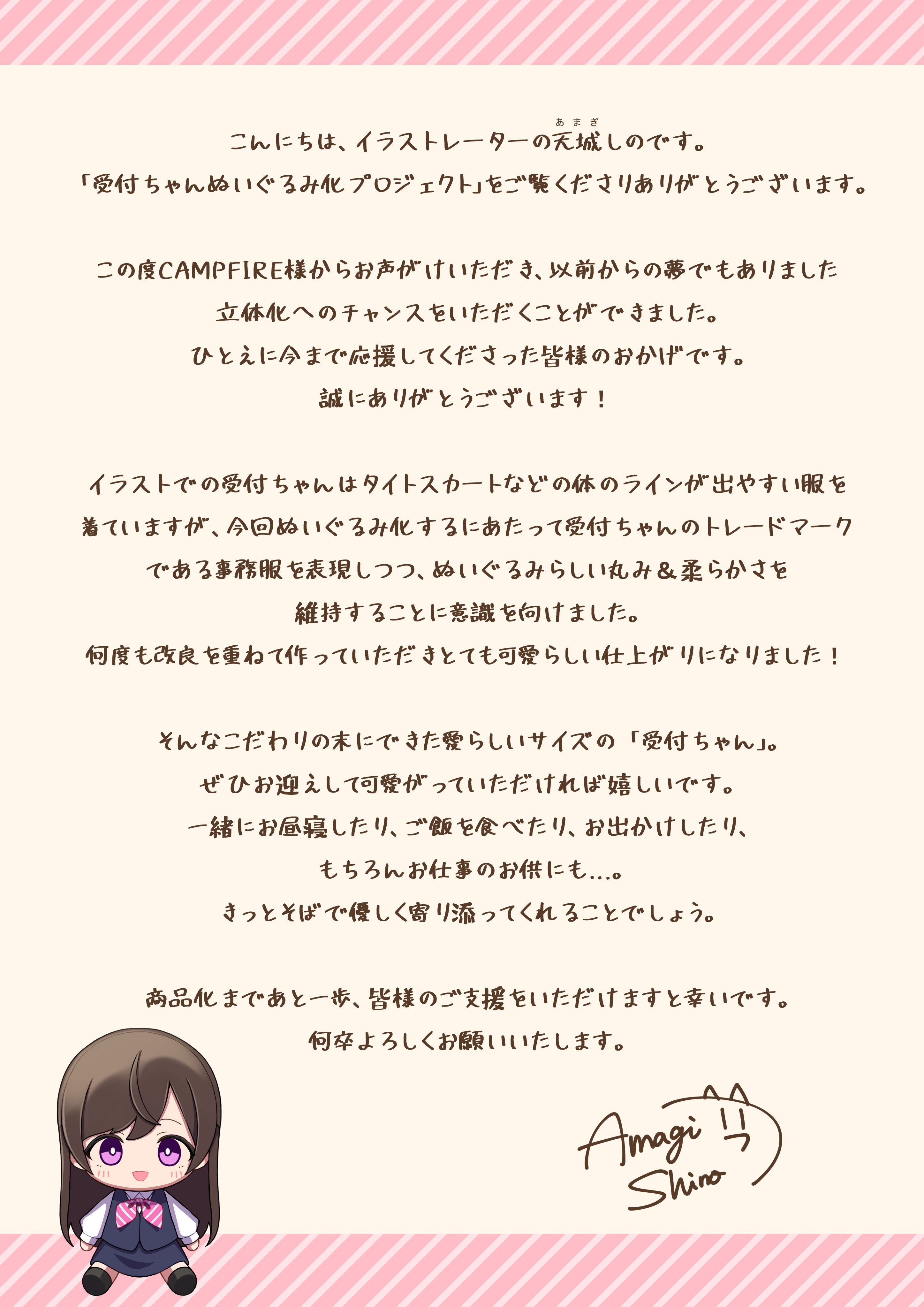 イラストレーター天城しのが描く「受付ちゃん」がぬいぐるみ化に挑戦します!