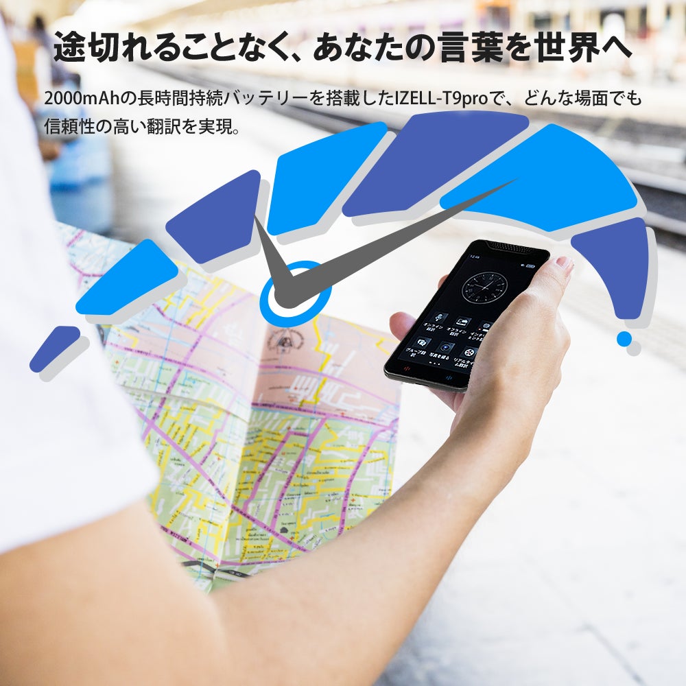 IZELL-T9proは、2000mAhの大容量バッテリーを搭載。長時間の使用でも安心して頼りにできます。朝から晩までのビジネスミーティングや、一日中の観光旅行でも、途中での充電の心配なし。スマホと別に持つことで、スマートフォンの電力も消費せず、外出先でも安心です。