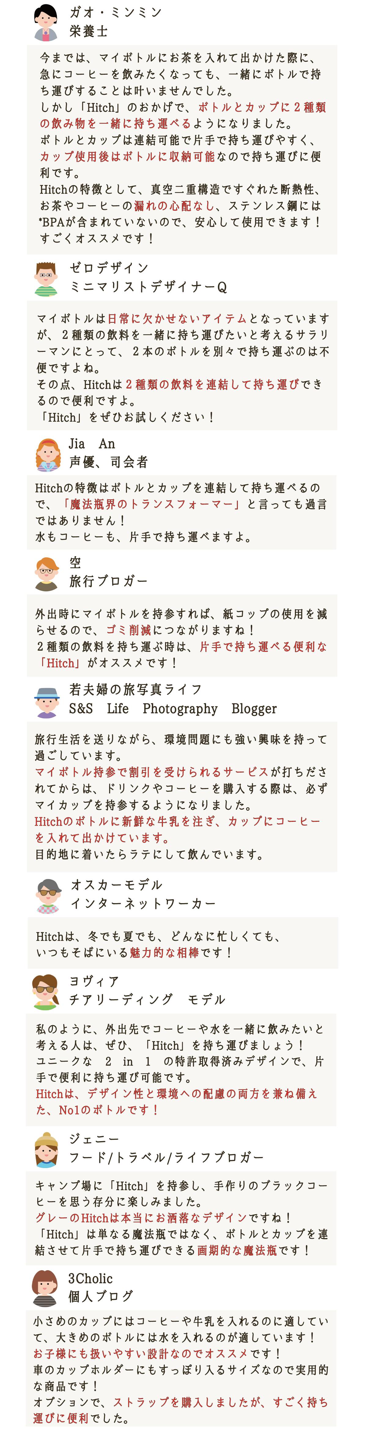 私がはじめてHITCHを見たとき、とても驚き、そして面白い!と思いました!スタイリッシュなデザインや、カップを底に収納するという奇抜なアイデアもさることながら、「再利用可能なボトルとカップを持ち運びやすくし、廃棄物をゼロにし、荷物を軽くする」という考え方に、なにより共感したのです。