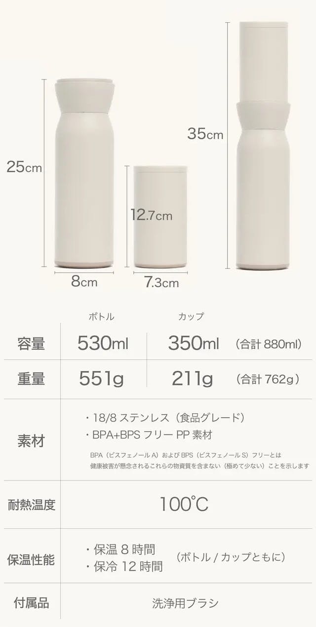 A.ボトルの容量は530ml、カップの容量は350ml、合計で880mlの大容量です。