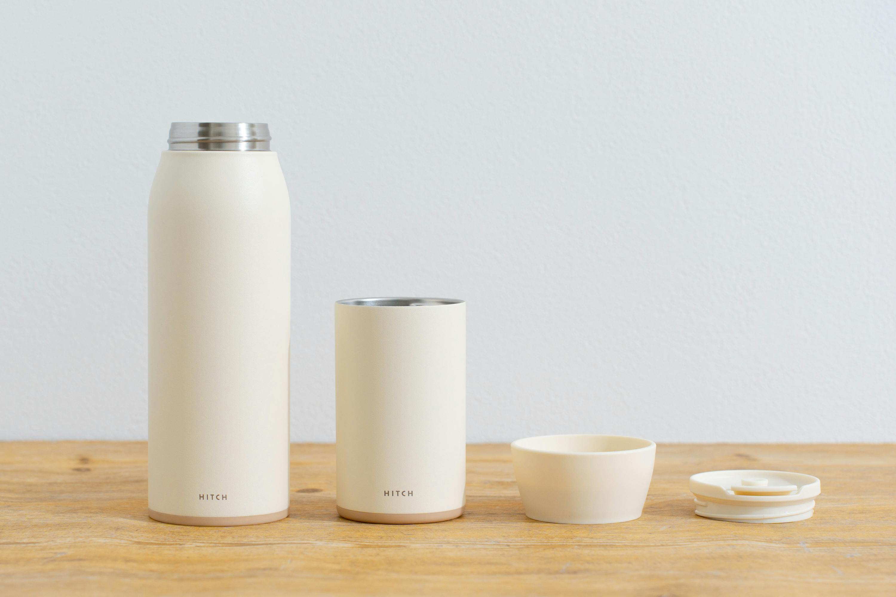 HITCHは530mlボトルと350mlカップを組み合わせた構造になっています。ボトルとカップはそれぞれ二重壁、真空断熱、ステンレス鋼、漏れ防止、BPA+BPSフリーおよび、食品グレードのステンレススチールです。