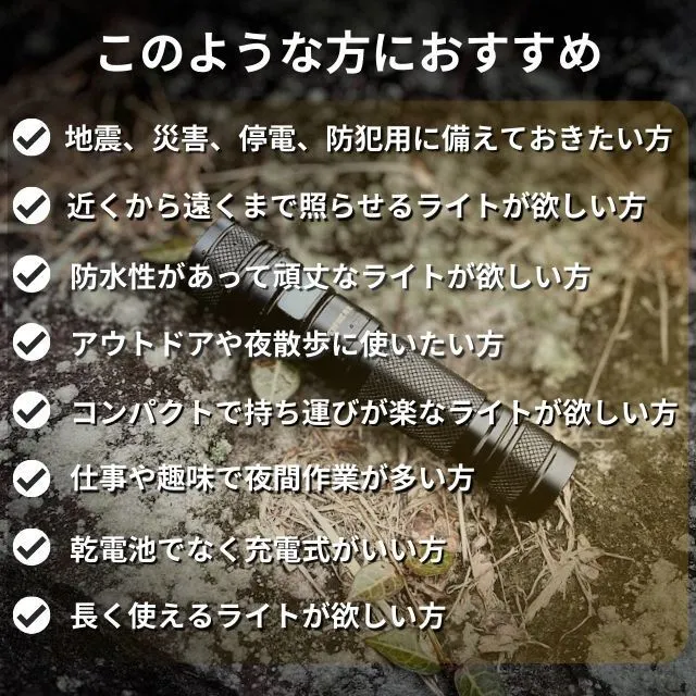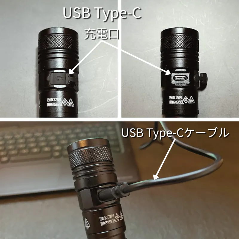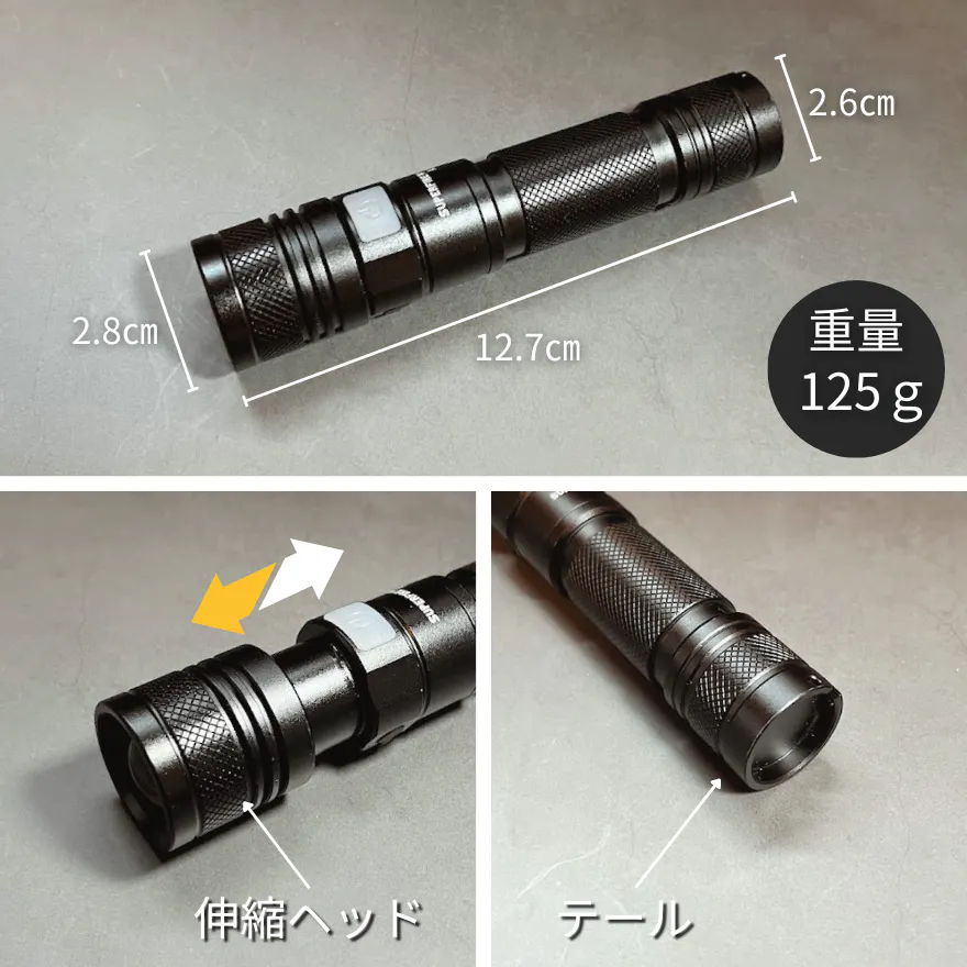 使用時間:高モード:約180分・中モード:約540分・小モード:約900分・ストロボモード:約180分・SOSモード:約540分