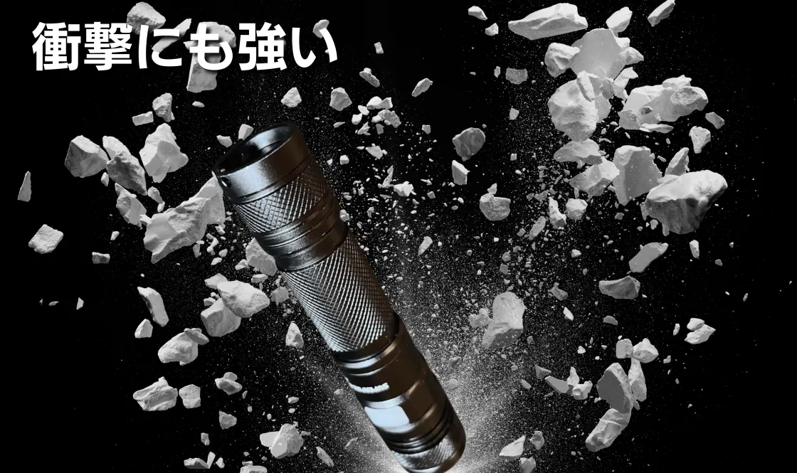 通常のプラスティック製や安価な懐中電灯は、落とすと破損の恐れがあります。しかし「AGLON2」のボディーは飛行機や宇宙船に使用される超頑丈な航空宇宙アルミニウム合金で出来ており、多少の衝撃や圧力が加わっても壊れない耐衝撃性を備えています。