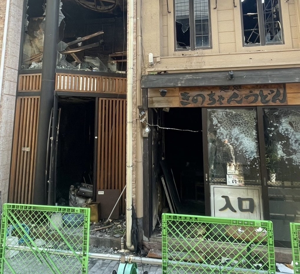 しかし、徐々にコトの重大さに気づき、必死の思いでお店に向かったところ、そこには大勢の消防隊の方々と火災に巻き込まれ全焼した「きのちゃんうどん」がありました。