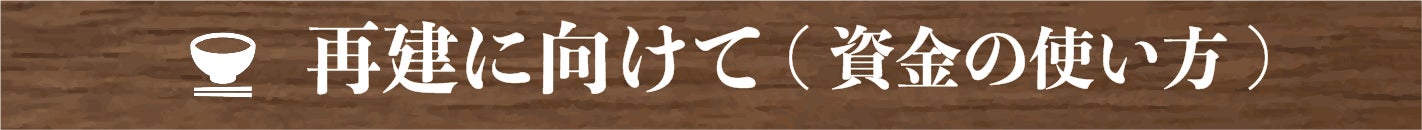 再建したお店をオープンさせるための、広報活動やプレオープンの準備、法的手続きなど各々の資金に当てさせていただきます。