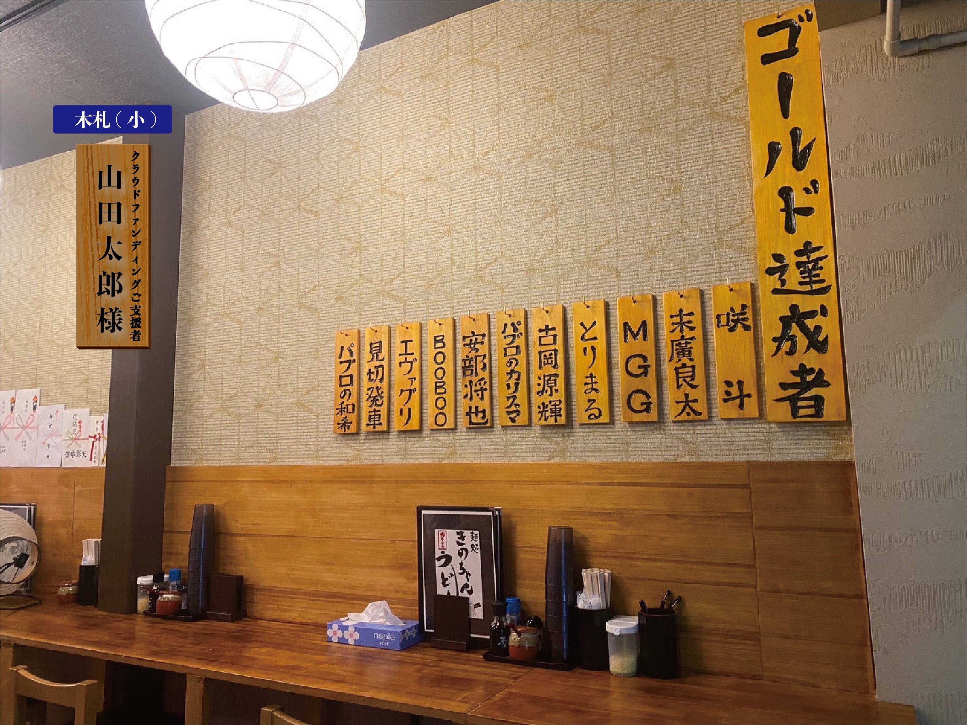 きのちゃんうどん再建後の店舗内に、ご支援者様のお名前を店舗が存続する限り飾らせていただきます。