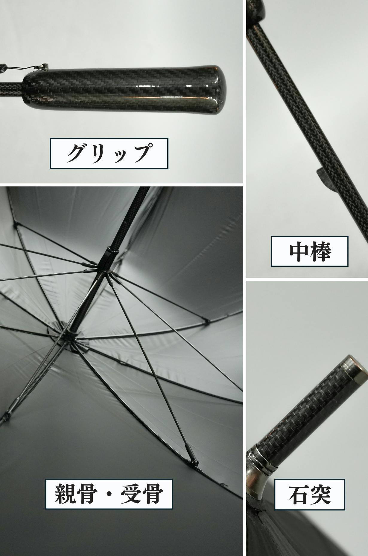 傘の先っぽにある石突から、手元のグリップまで、使えるところには全てカーボンファイバーを使用したこだわりの長傘です。
