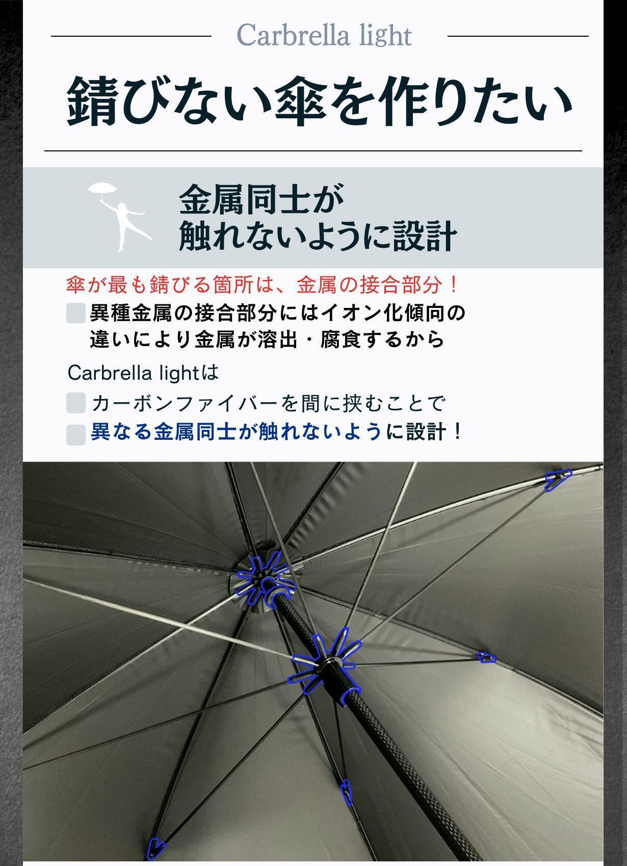 Carbrella lightは手で触れることが多い部分に耐蝕性が高いカーボンファイバーを使用することで傘の劣化を防いでいます。