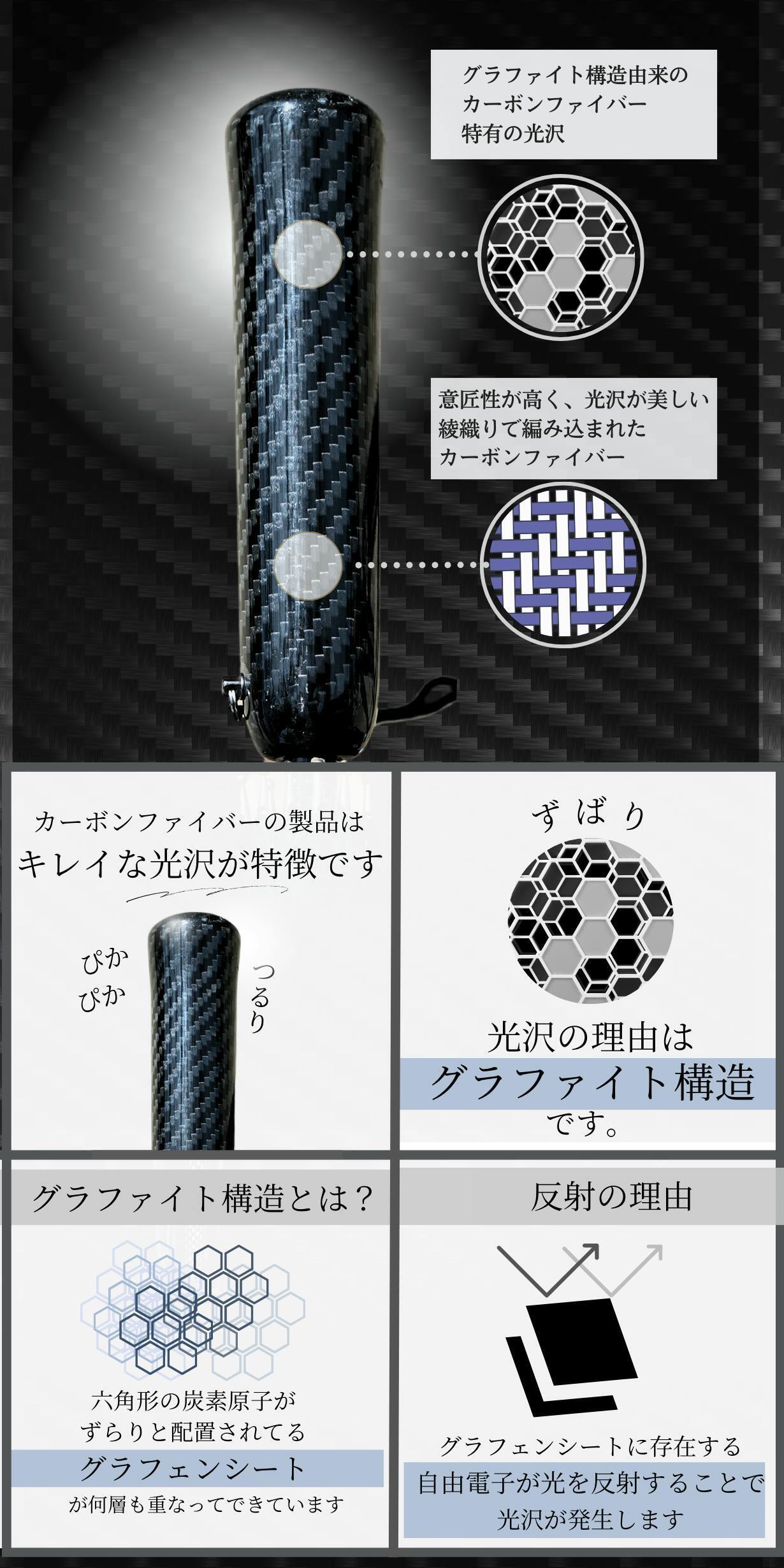 金属とは一味違ったカーボンファイバー特有の光沢を楽しめます。