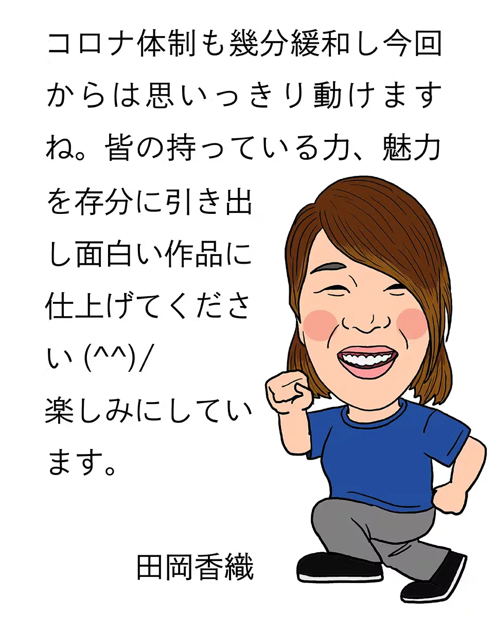 コロナ体制も幾分緩和し今回からは思いっきり動けますね。皆の持っている力、魅力を存分に引き出し面白い作品に仕上げてください(^^)/ 楽しみにしています。”