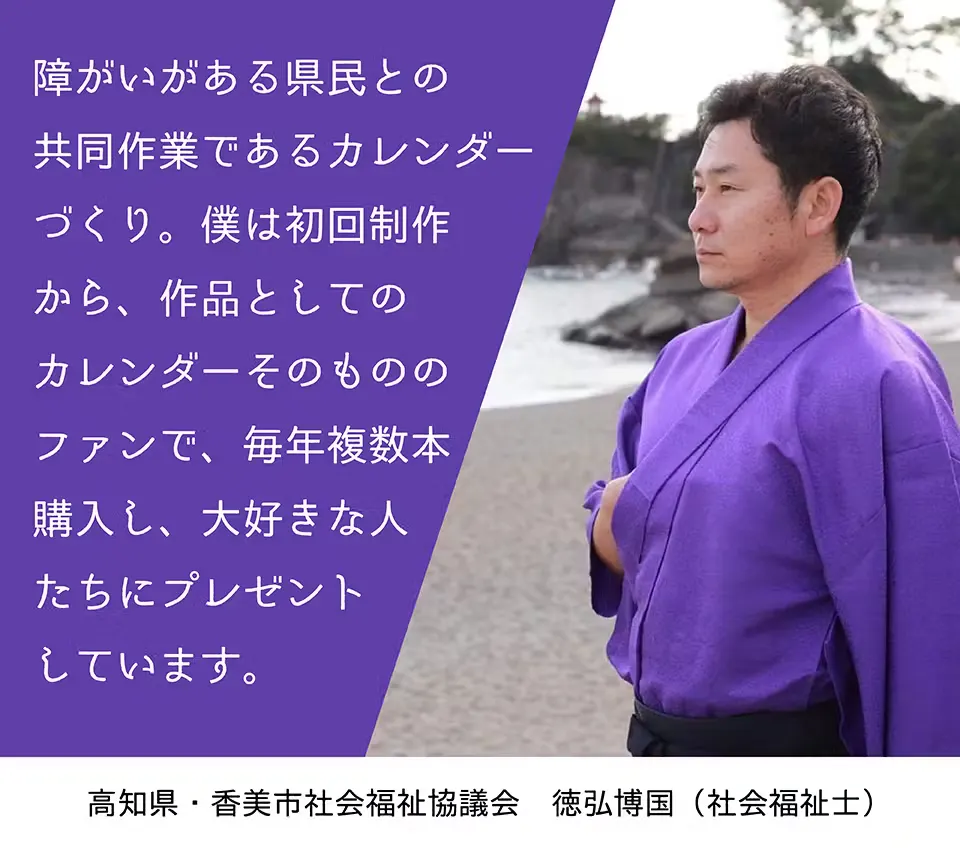 ”このカレンダーは、いろんな意味でめちゃめちゃ素敵です。純粋な作品としておしゃれでカッコいいのでお勧めであるうえに、高知県内の様々な障害のある方々との共同作業で楽しみながら作成している。そんな「幸せ×幸せ」なカレンダーを多くの方に手に取ってもらいたい。このCFの挑戦を心から応援します。”