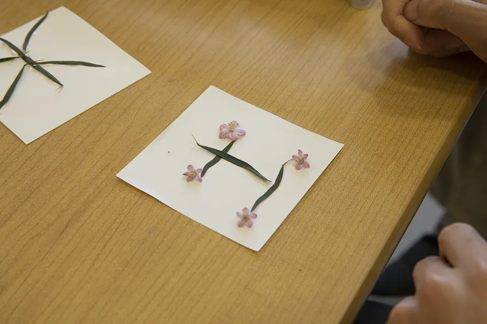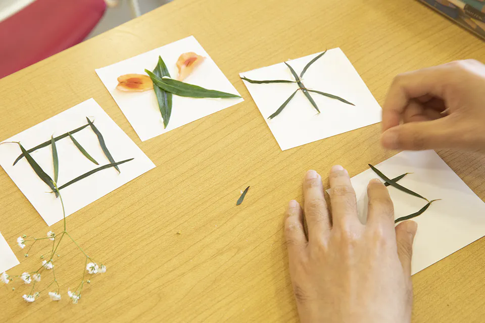 ● 高知の野に咲く花や植物、浜辺で拾った素材などをたくさん使用し、みんなが自由に数字や文字を作りました。