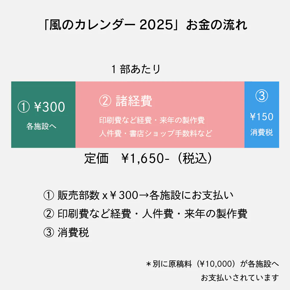 ② 諸経費 印刷費など経費・来年の制作費・人件費など。「風のカレンダー」は多くの書店や店舗・ネットショップなどでも販売していただいていますが、その際の販売手数料もここに含まれます。