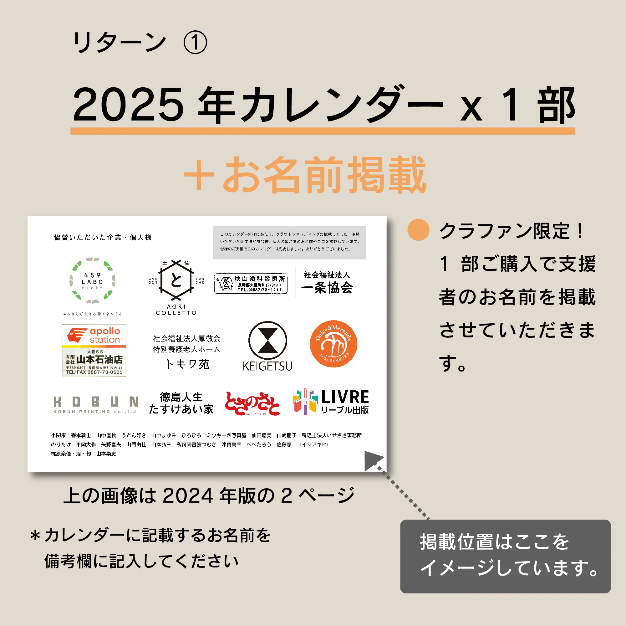 ● カレンダーのページ内にお名前を掲載させていただきます。