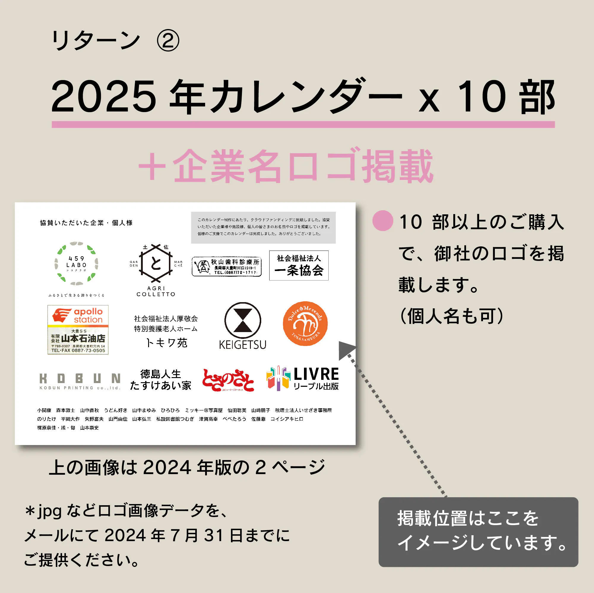 ● 10部以上のご購入で、企業様や商店様にはカレンダー内のページにて御社のロゴを掲載させていただきます。