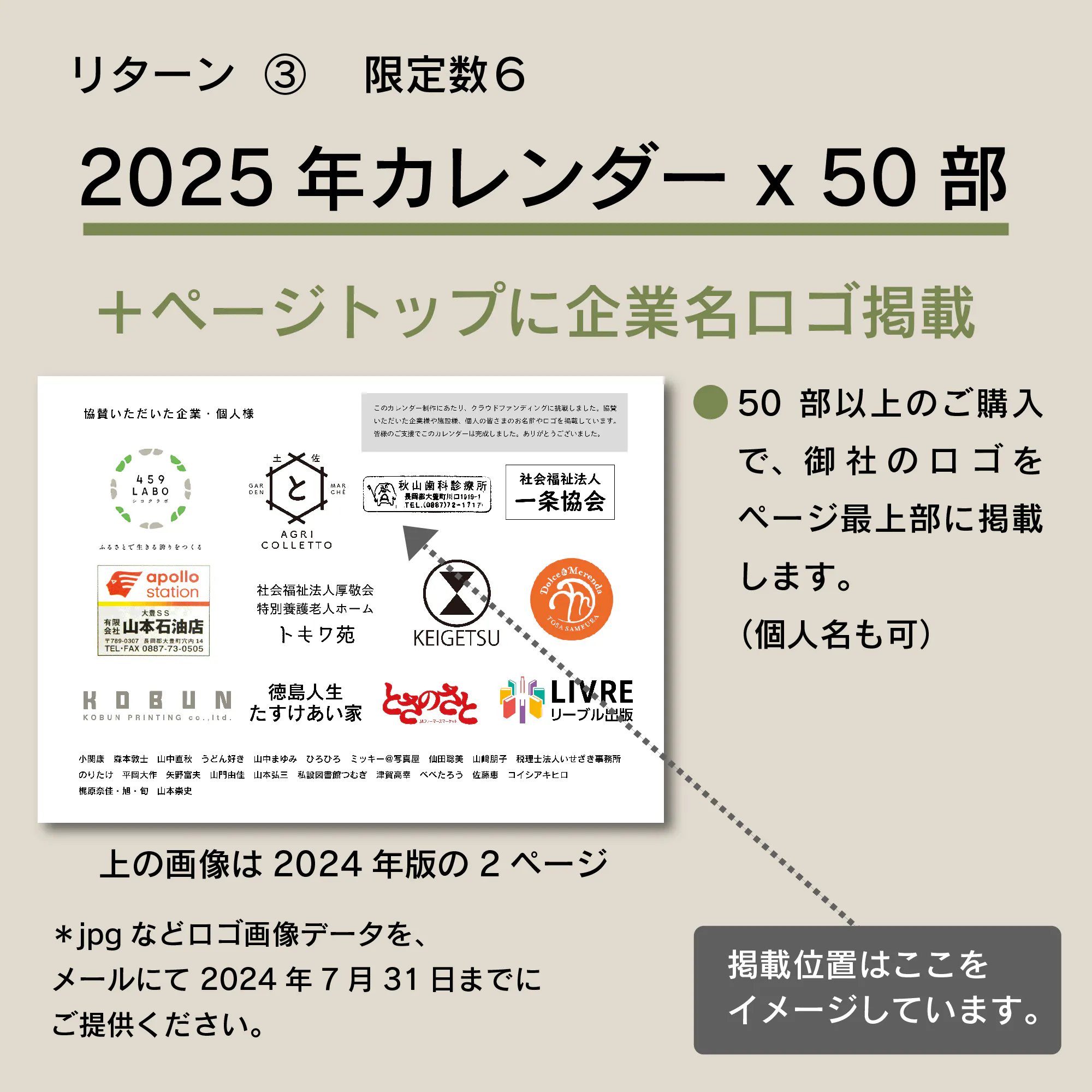 ■ リターン③ カレンダー50部以上をご購入 企業協賛ーロゴ掲載 ¥82,500