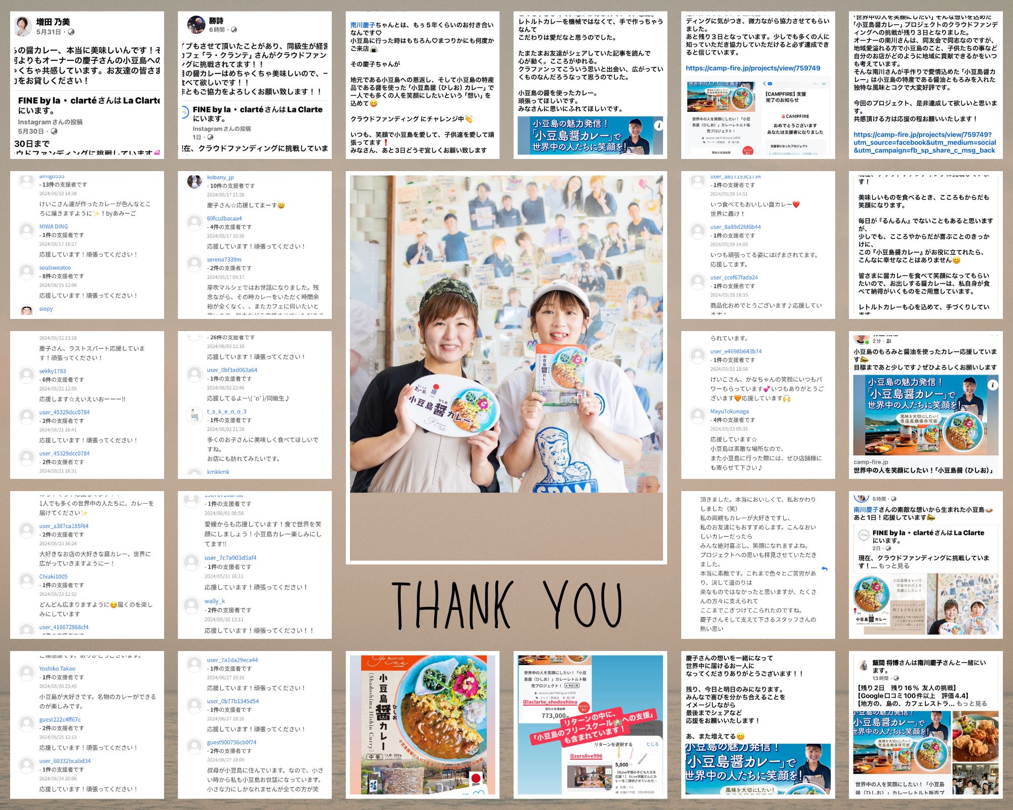 2024/07/01 10:32【感謝申し上げます】この度は、『小豆島醤カレーで世界中の人を笑顔にしたい!』という私の想いに賛同して下さり、ご支援を賜りましたこと、心より感謝申し上げます。みなさまお1人、お1人の応援があったから達成することができました。皆さまの想いを大切に、これからもたくさんの人が、醤カレーを通じて笑顔になって頂ける様、日々積み重ねていきますので、今後とも、FINEを、醤カレーを、私たちを応援よろしくお願いします!子どもたちへのご支援をお届けした様子などはまた改めてご報告させて頂きます。 もっと見る