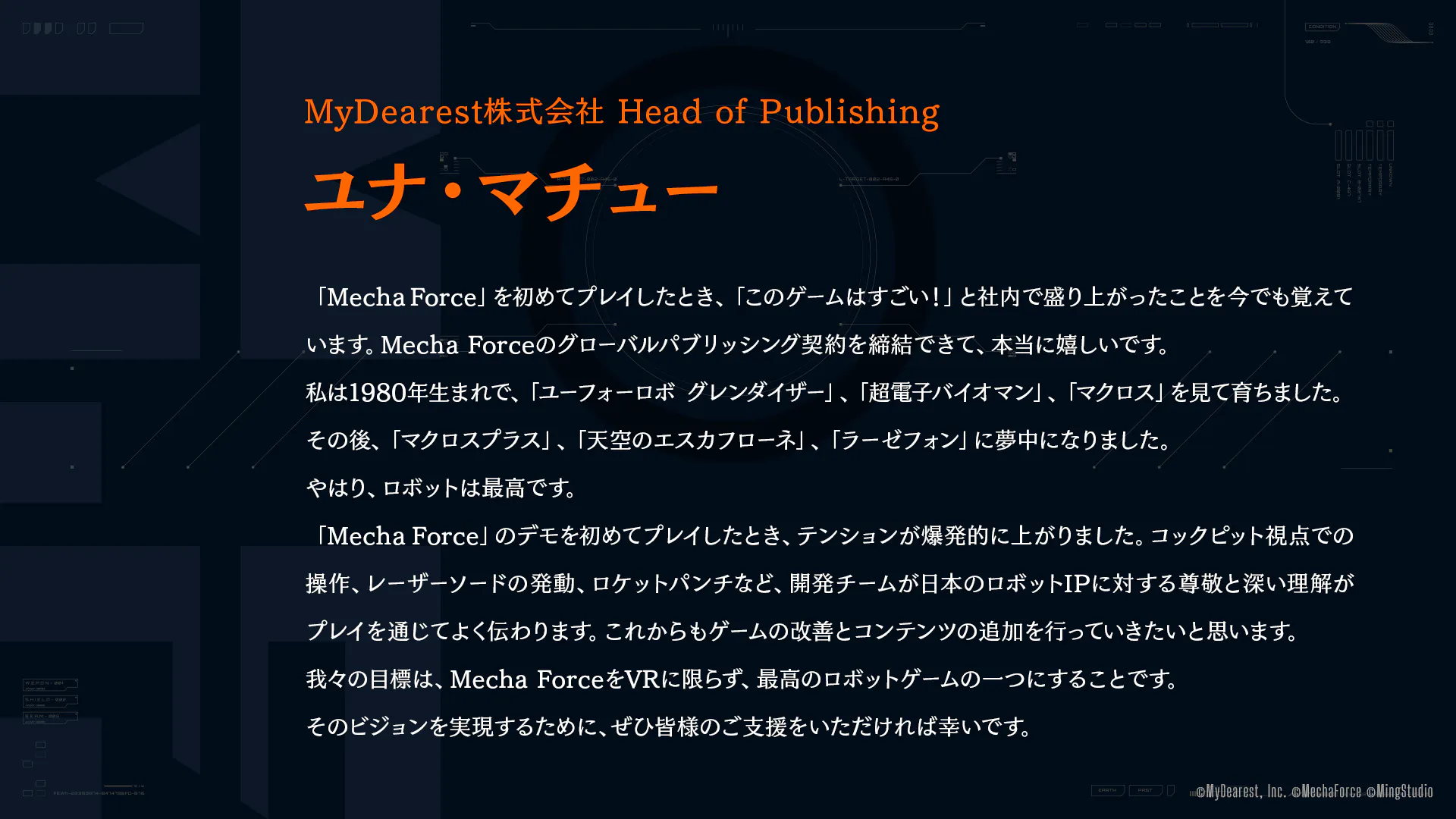 MyDearestは、『Mecha Force -メカフォース-』のマーケティングパートナーとして、その活動を支援し、本クラウドファンディングの窓口業務を担当しています。