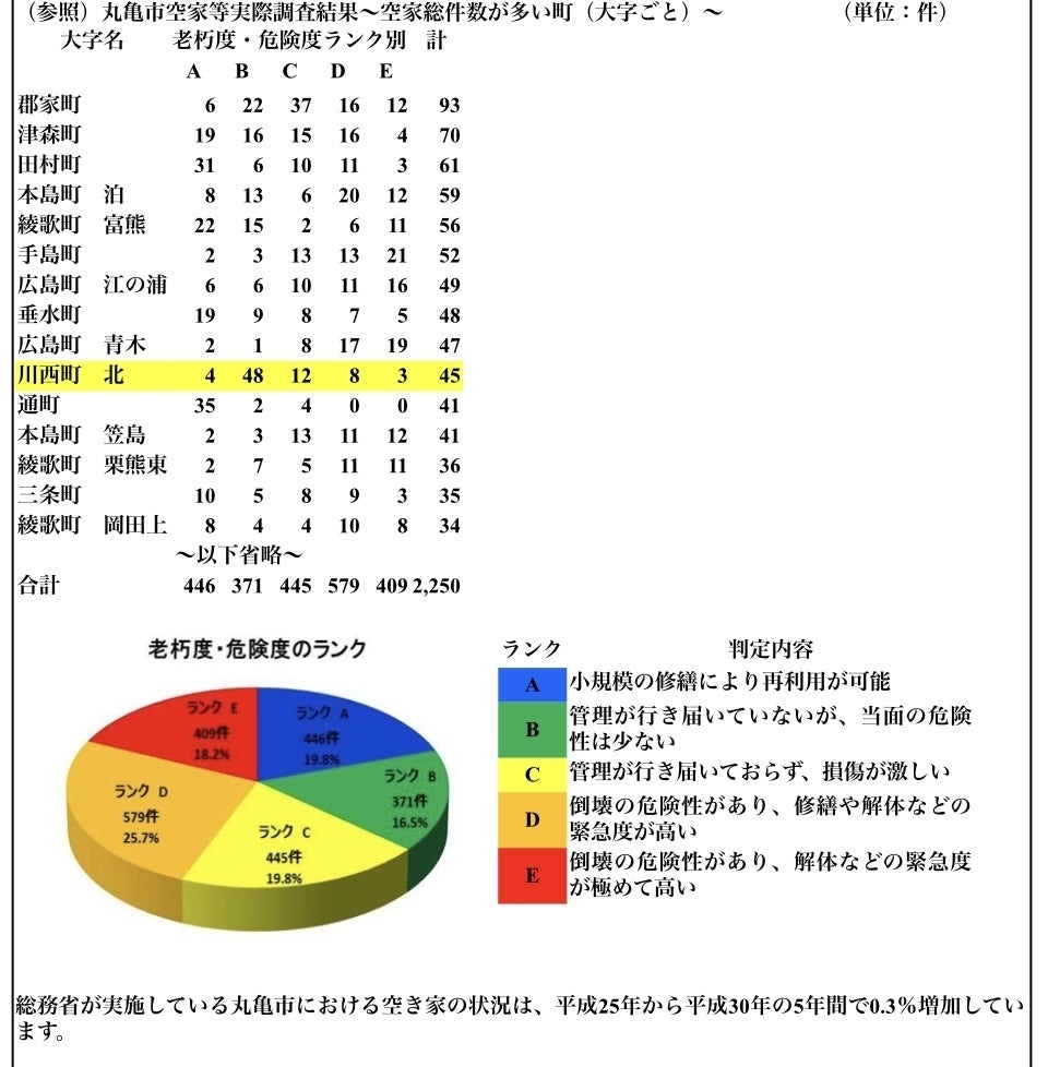 現在、丸亀市の空き家は、少子高齢化や核家族化などにより年々増加しており、今後も人口減少などによってさらに増えていくと見込まれます。所有者等に、適切に維持管理されている空き家は問題ありませんが、様々な理由から長期間放置されている空き家は、老朽化による倒壊、樹木、雑草の繁茂、不法侵入などの問題が発生し、防災、衛生、景観等地域住民に、深刻な悪影響を及ぼしていることが近年大きな問題となっています。私達が空き家を活用してゲストハウスにしようとしている川西町北も、平成27年度の丸亀市空家等実態調査の結果、残念ながら空家総件数が多い町のトップ10(136町(大字)中)に入っています。