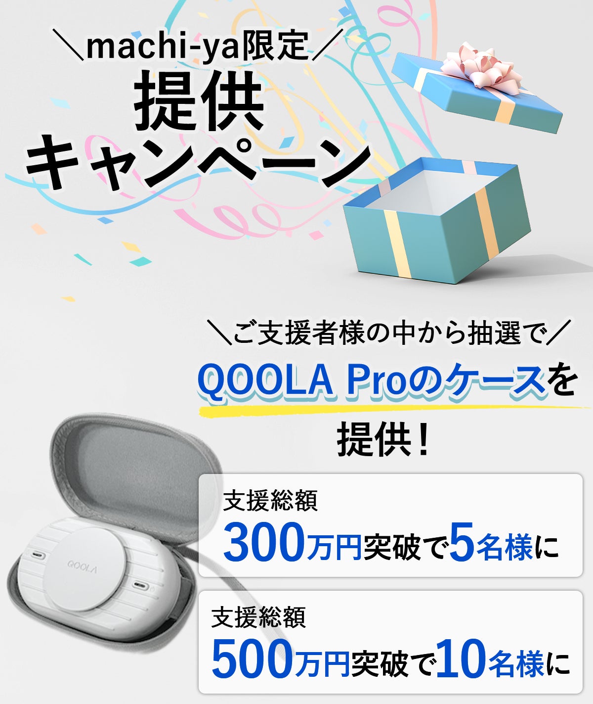 大好評をいただき大成功したプロジェクトを記念して、machi-yaだけの購入者限定提供キャンペーンを実施します!ご支援者様の中から抽選で当たった方に、なんとQOOLA Proのケースを提供!!