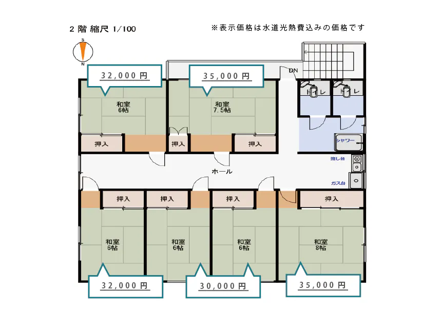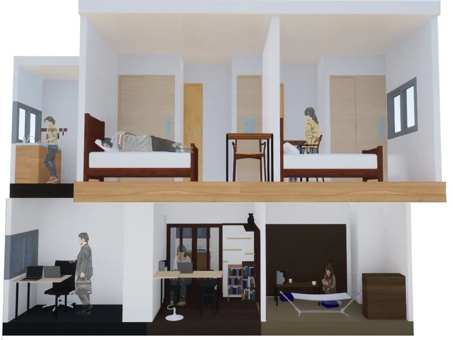 2F【住居部分】左から供用キッチン、各部屋1F左からシェアオフィス、コワーキング、ゆったりできる和室