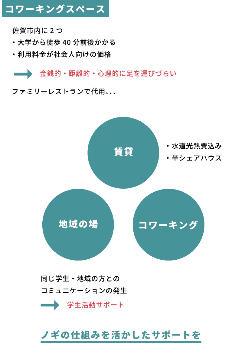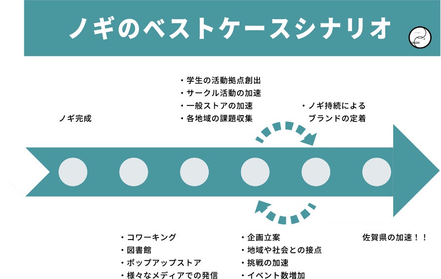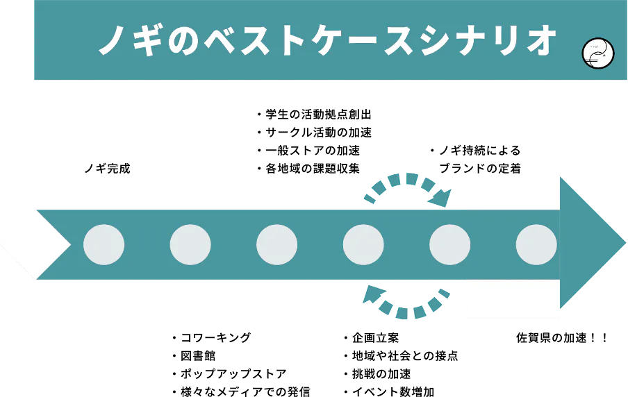 ノギという場所から佐賀の学生の活動、挑戦の場生み出し、学生の活動を加速させます!そして、その活動は必然的にノギを通って、地域に還元され、佐賀全体を加速させることでしょう。