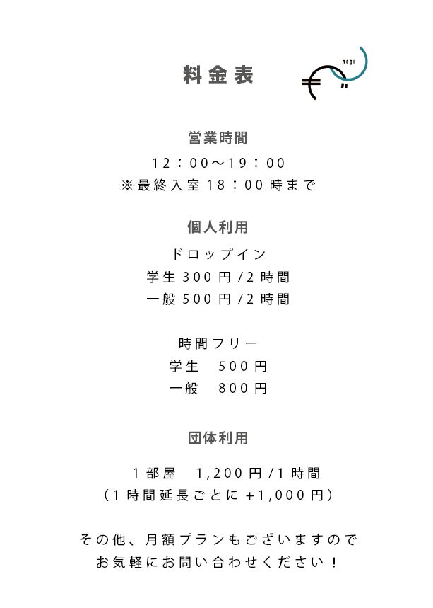 【日々の営業】 営業日:12:00~19:00(最終入室18時) 定休日:毎週月・火