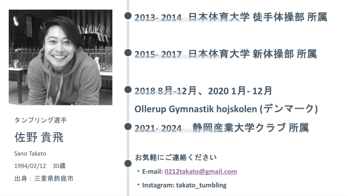 国際情勢が日々変化する中、物価も日々上昇し、先行きが見通せないこの世の中、無理を言っているのは十分承知ですが、タンブリング選手、佐野貴飛の最後の”悪あがき”だと思って叱咤激励、ご支援頂ければとても嬉しく、またとてつもない原動力になります。