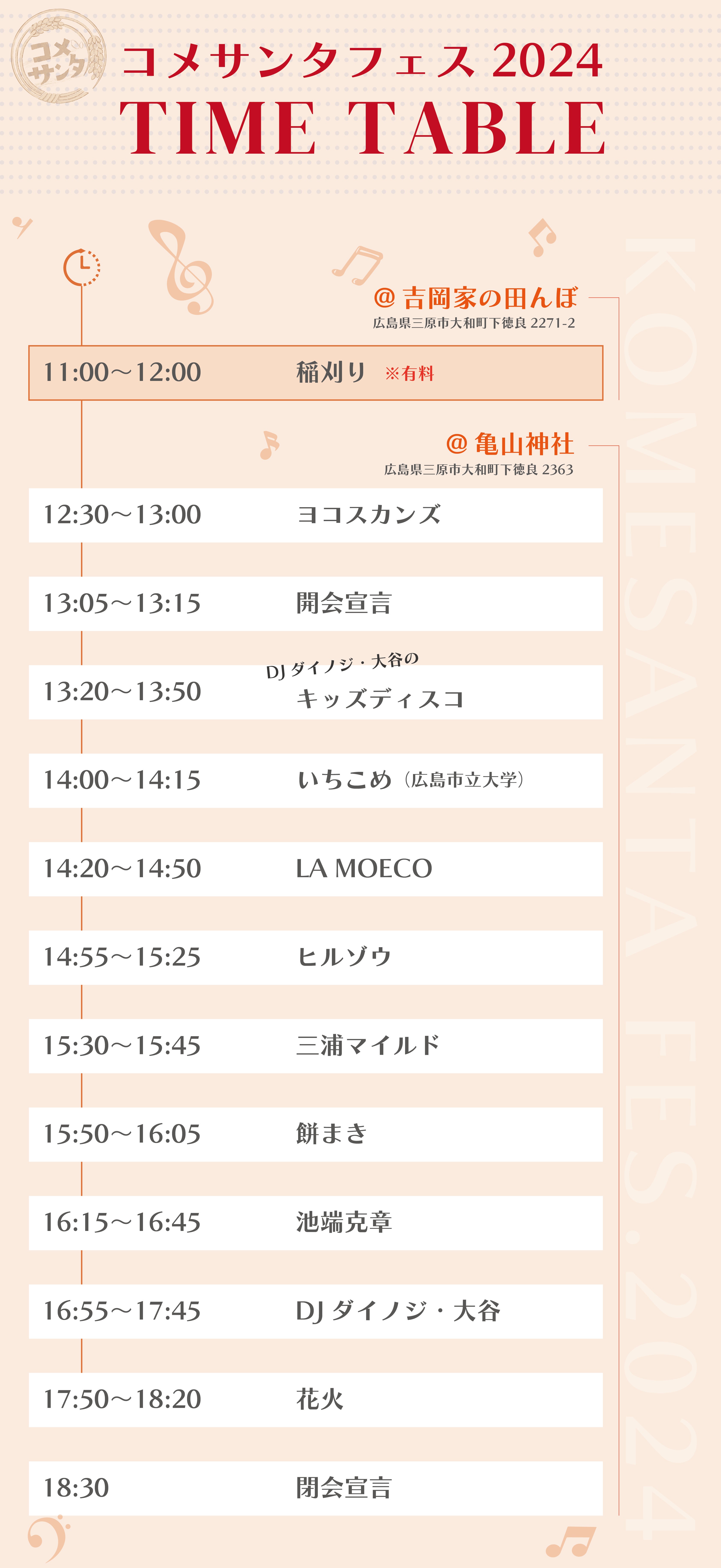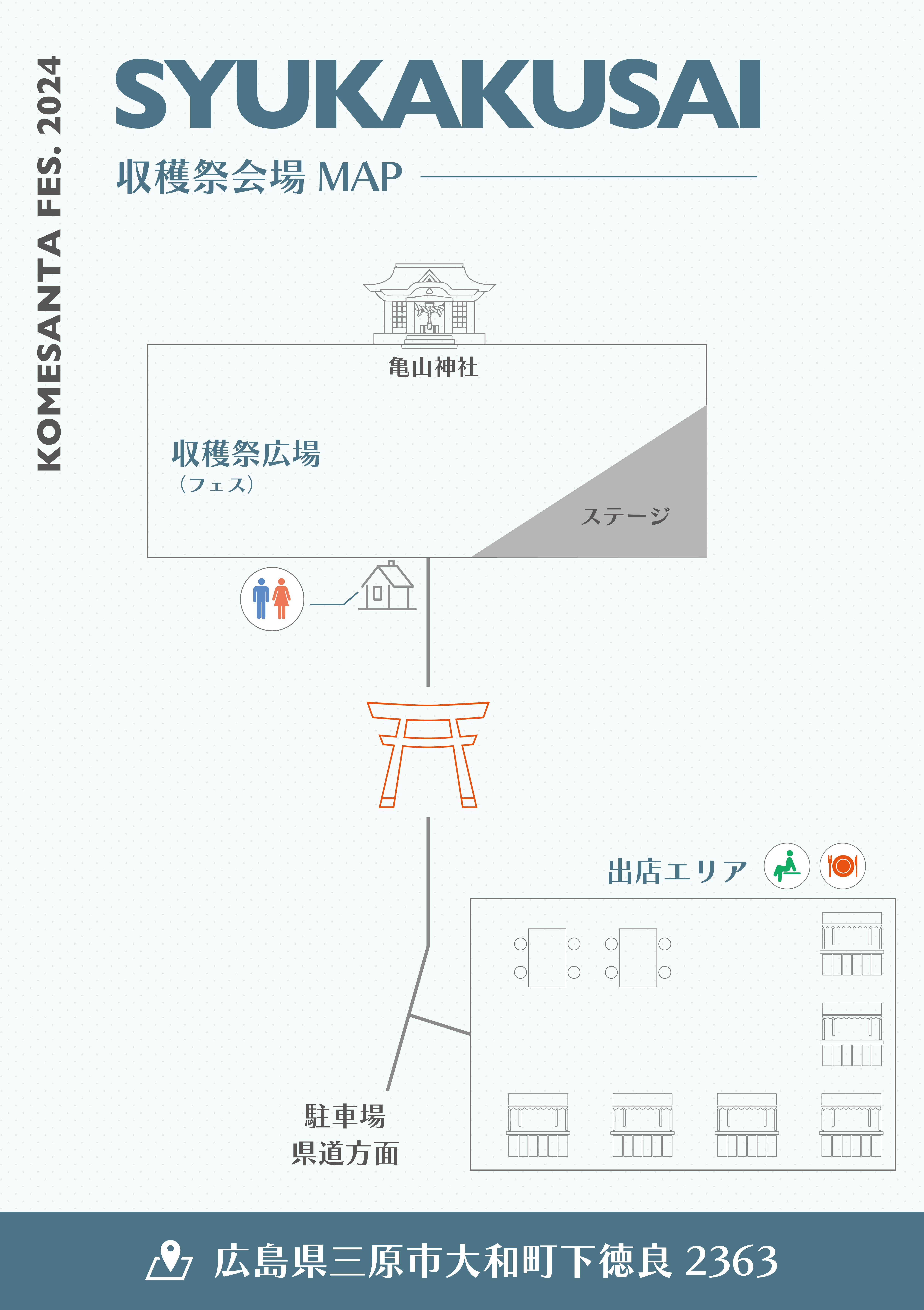 ※稲刈り会場、お祭り会場(亀山神社)、には隣接する駐車場はございません。