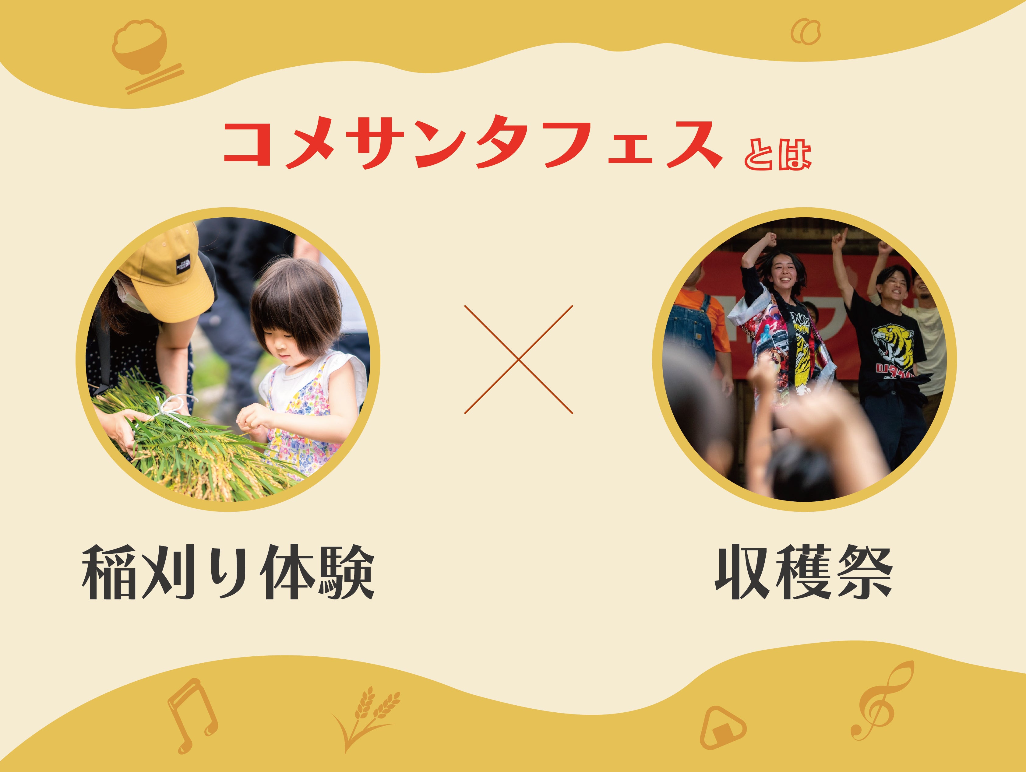 『コメサンタフェス』は、稲刈り体験と音楽や出店を楽しむ収穫祭を組み合わせたイベントです。