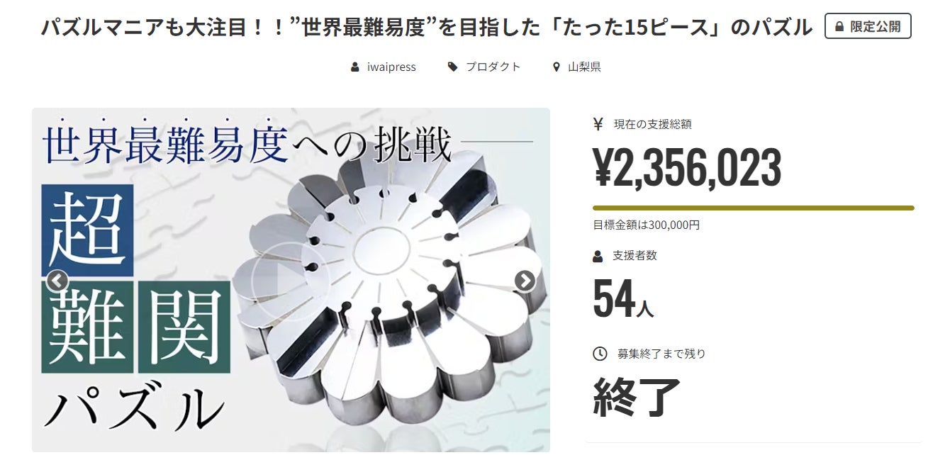2024/08/27 12:00皆様こんにちは。岩井プレスです。こちらのプロジェクトも残り4日間となりました。大人が本気で遊べるパズル、お求めやすい価格はこれで最後になりますので是非お求めください。海外から多くのお問い合わせを頂き、こちらのプロジェクト終了と同時に海外での展開が決まっております。そんな人気なZIRELがこの価格で購入できるのも残り4日です。是非、最後までよろしくお願い致します。 もっと見る