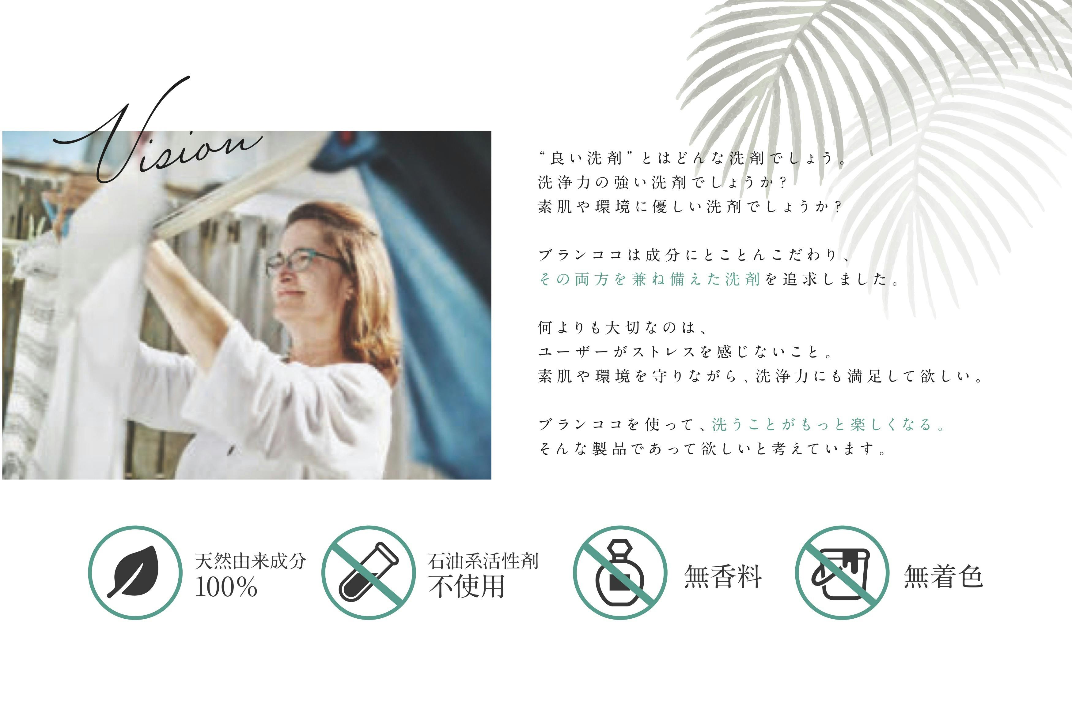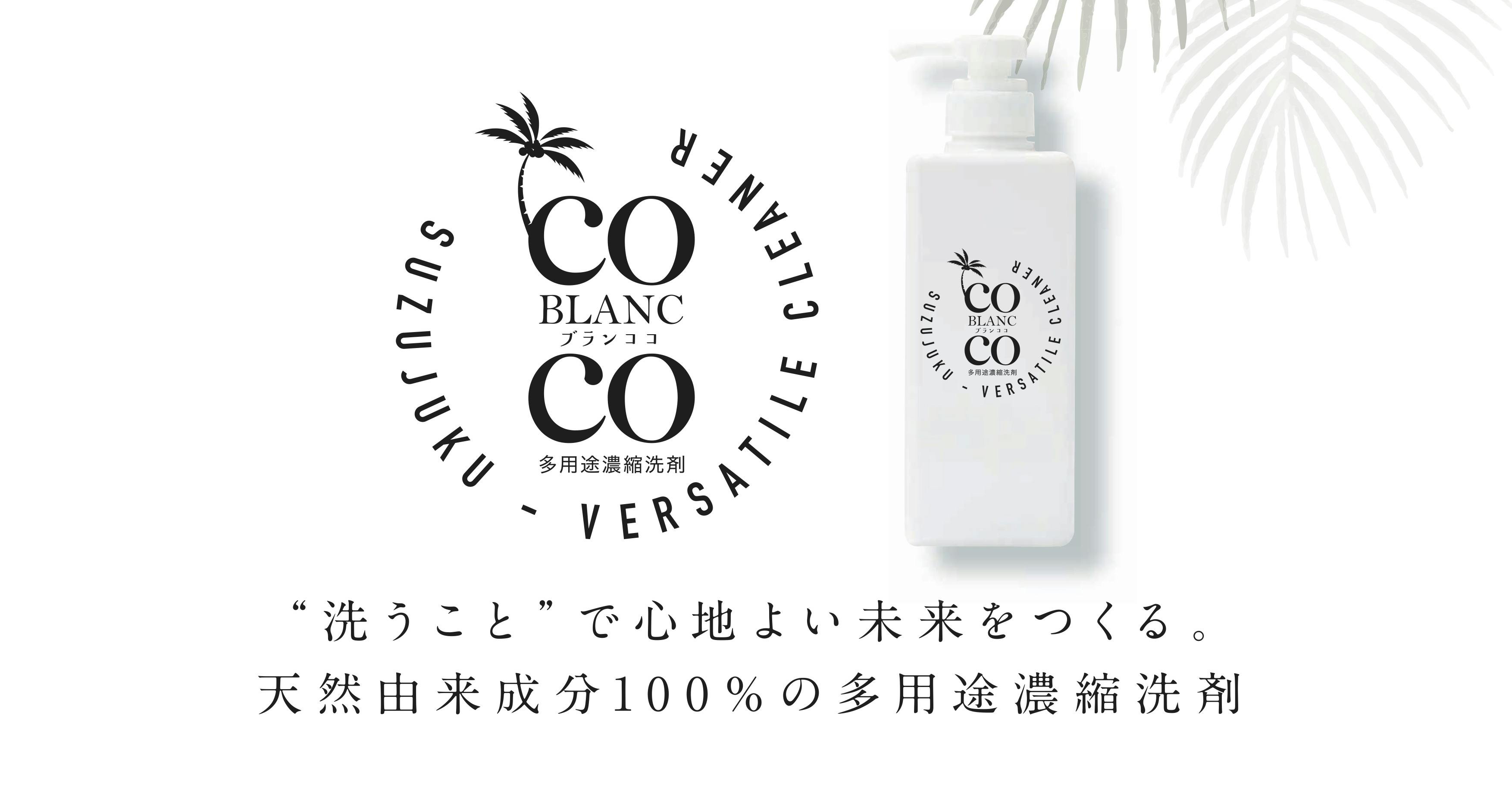 多用途濃縮洗剤「ブランココ」は、「天然由来成分100%」なので「石油系活性剤不使用」「無香料」「無着色」だから「素肌や環境にやさしい」ことはもちろん、「強い洗浄力」「泡立ちがよく」「香りも自然」そして何よりも、「すぐれたコストパフォーマンス」を実現しました。