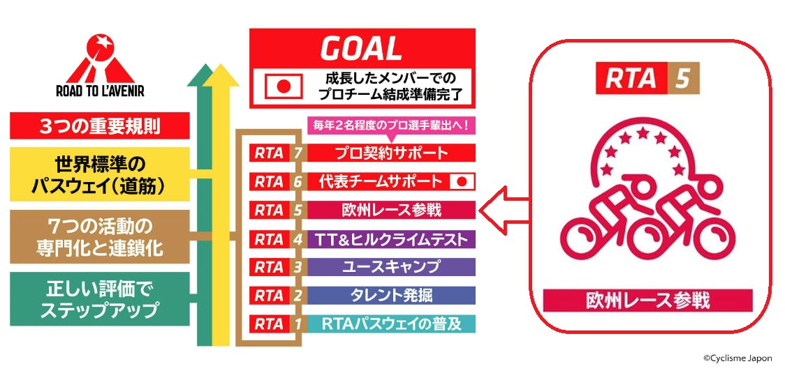 「ロード・トゥ・ラヴニール=Road to l'Avenir (RTA)」は、日本の選手がツール・ド・フランスに『出る事』や、世界トッププロチームに『入る事』のみではなく、それ以降の長期的に活躍できる日本選手の輩出を目的としています。そのためには、才能のある若い選手達を出来るだけ早く世界標準のパスウェイ =道筋へと誘い、そこを地道に歩ませる事が必須です。比較的地味な歩みを伴う活動ですが、それを継続する事により、自ずと「晴れ舞台」が手繰り寄せられてくるはずです。なぜなら、現在の世界トップロード選手達のほぼ全員が同様の道筋で現在の地位を掴んでいるからです。