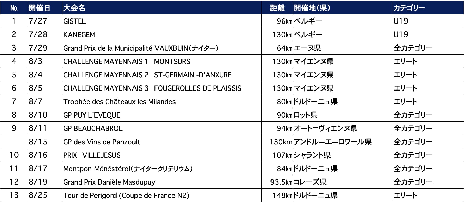 中世の城下町モンパジエで1948年から開催されているプロアマオープンの伝統エリートレース。アップダウンを含む1.3kmの極めて小さな市街地サーキットを65周、合計84.5kmのレースで、集団からちぎれたら最後、完走は不可能といえる厳しいレースです。中世の街並みらしく路面は悪く、さらに夜に開催される"ノクターン"レースのため、視界も良好とはいえません。比較的安全な環境でレースが行われる日本の選手にとって、欧州のロードレースの厳しさや粗削りさを一発で体感できる大会となっています。