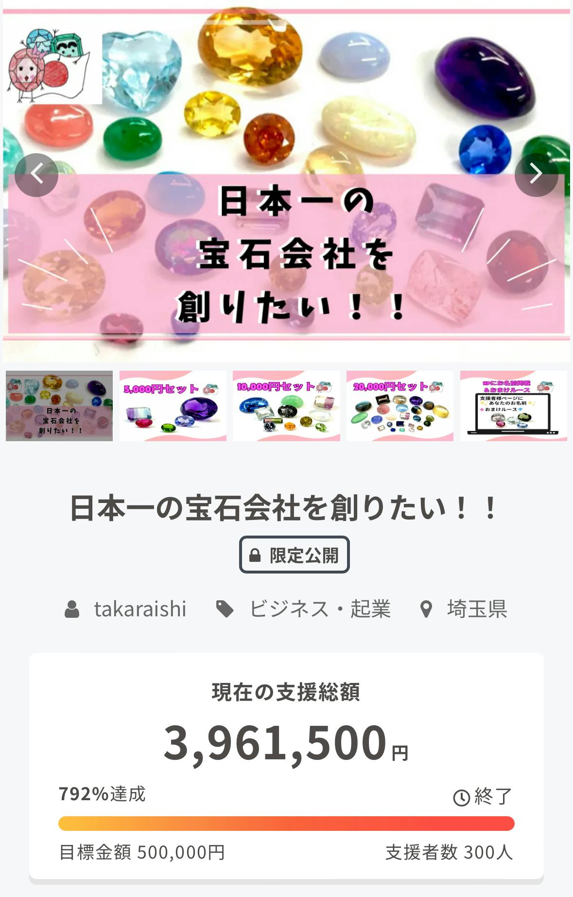 2024/09/01 21:02この度は当社立ち上げのクラウドファンディングにご支援いただきまして、本当にありがとうございます!8月末に、無事に集まった資金のご入金を頂きましたので、ご報告を致します。集まった資金に関しては、会社の立ち上げやこれまでの仕入などにかかった費用の支払いなどにあてつつ、今後の出展費や仕入れ費用に引き続き大切に使わせて頂きます。また、遅くなりましたが、無事に8月より展示会への出展も出来ております。 プレオープンの北九州ミネラルマルシェ、ブランドオープンのみなとみらいミネラルマルシェ、そして静岡ミネラルマルシェ、神戸ミネラルマルシェと出展をしてきました。現地でも「支援しました」という声も多数いただき、本当にスタッフ一同感動しております。今後も、より良い宝石をより安い価格で提供できるルースショップを展開して参ります。引き続き、展示会などにも足を運んで頂けますと幸いです。いつになるかはまだ未定ですが、展示会に足が運べない方達のためにも、ネットショップや、こうしたクラウドファンディングを通じて宝石が届けられればと思っております。今後とも、株式会社たからいし、そしてたからいしルースを宜しくお願いいたします!株式会社たからいし代表取締役天沼慎五 もっと見る