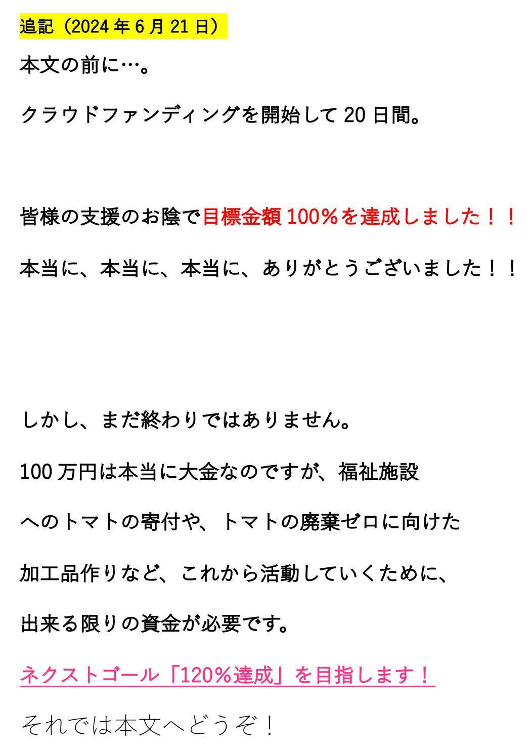 2024/07/04 22:10来シーズンは廃棄削減50トンを実現します!こんにちは。農園とフォーク青果店の中村です。本プロジェクトへのご支援改めまして、心よりお礼申し上げます。クラウドファンディング終了から10日が経過し各方面からお声掛けいただきまして、廃棄ゼロの実現に向けて、多くの進展がありましたのでここで皆様にご報告いたします。・複数のイベント企画会社のフードイベントへ参加します(まずは今月熊本駅前アミュ広場で)・少量ですが、熊本市動植物園への廃棄トマト寄付が決まりました・県内外の福祉施設への廃棄トマトの寄付が増えます・県内外の複数の飲食店さんで廃棄トマトを使用していただきます・八代市からのサポートを受けながら進みますその他にも、実現すれば、数百tの廃棄削減が出来そうなお話も何個か頂いており、期待に胸を膨らませております。皆様のご支援のお陰で、クラウドファンディングをきっかけに更に多くの方に知っていただける機会となりました。先日、支援者リストを確認しましたところまた、喜びと感謝で胸がいっぱいになりました。学生時代に沢山笑い合った友人達からの支援世間知らずな僕を受け入れてくれ、多くの刺激をくれた仲間達からの支援見ず知らずの僕の夢を信じてくれた方からの支援普段から僕を応援し続けてくれる方からの支援僕は、沢山の方に支えられ生きてきたんだな。改めてそう思いました。本当に本当に本当に…ありがとうございました。 もっと見る