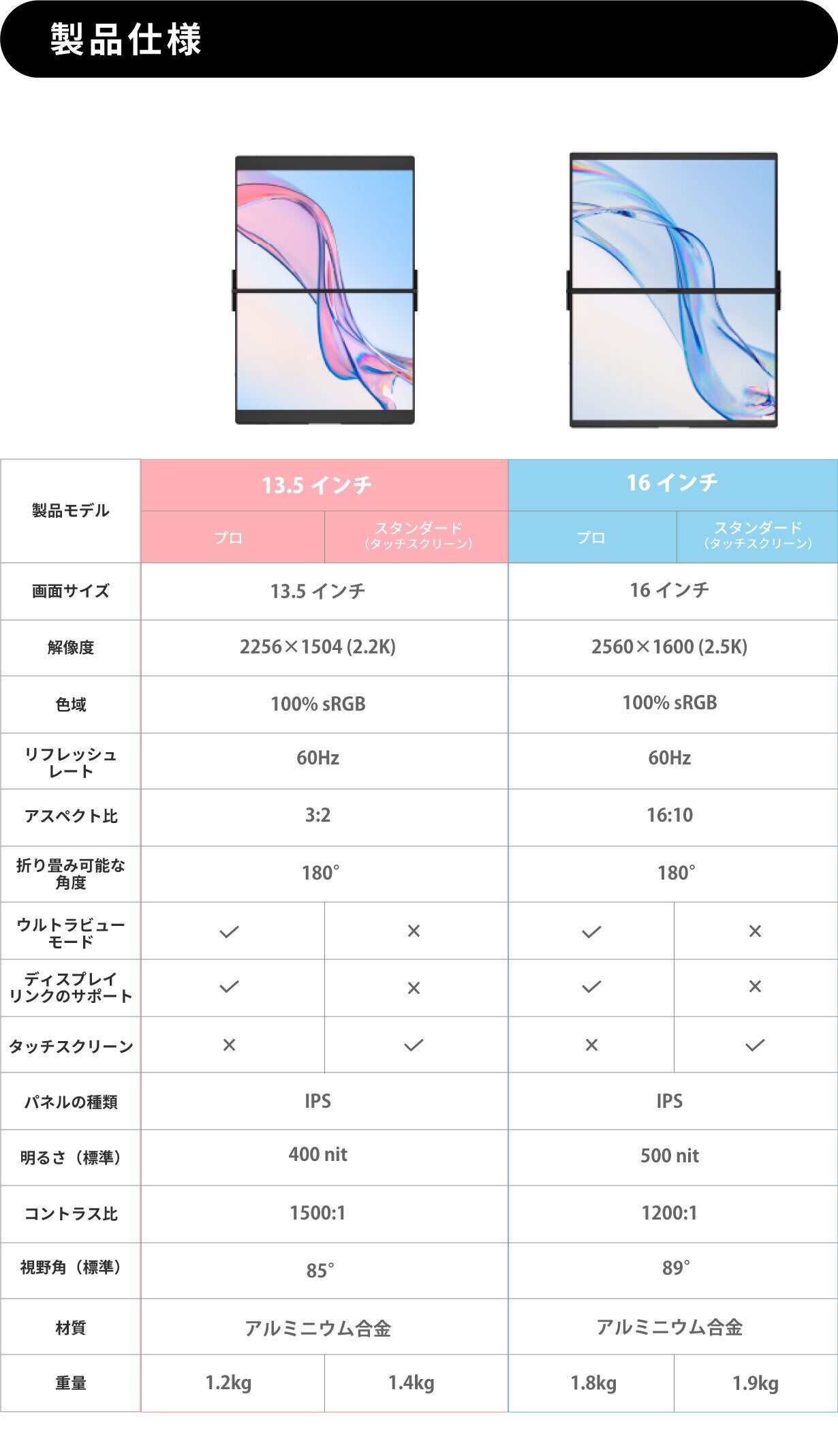 A: 13.5"は2256 × 1504(2.2K)、16"は2560 × 1600(2.5K)の解像度を提供します。