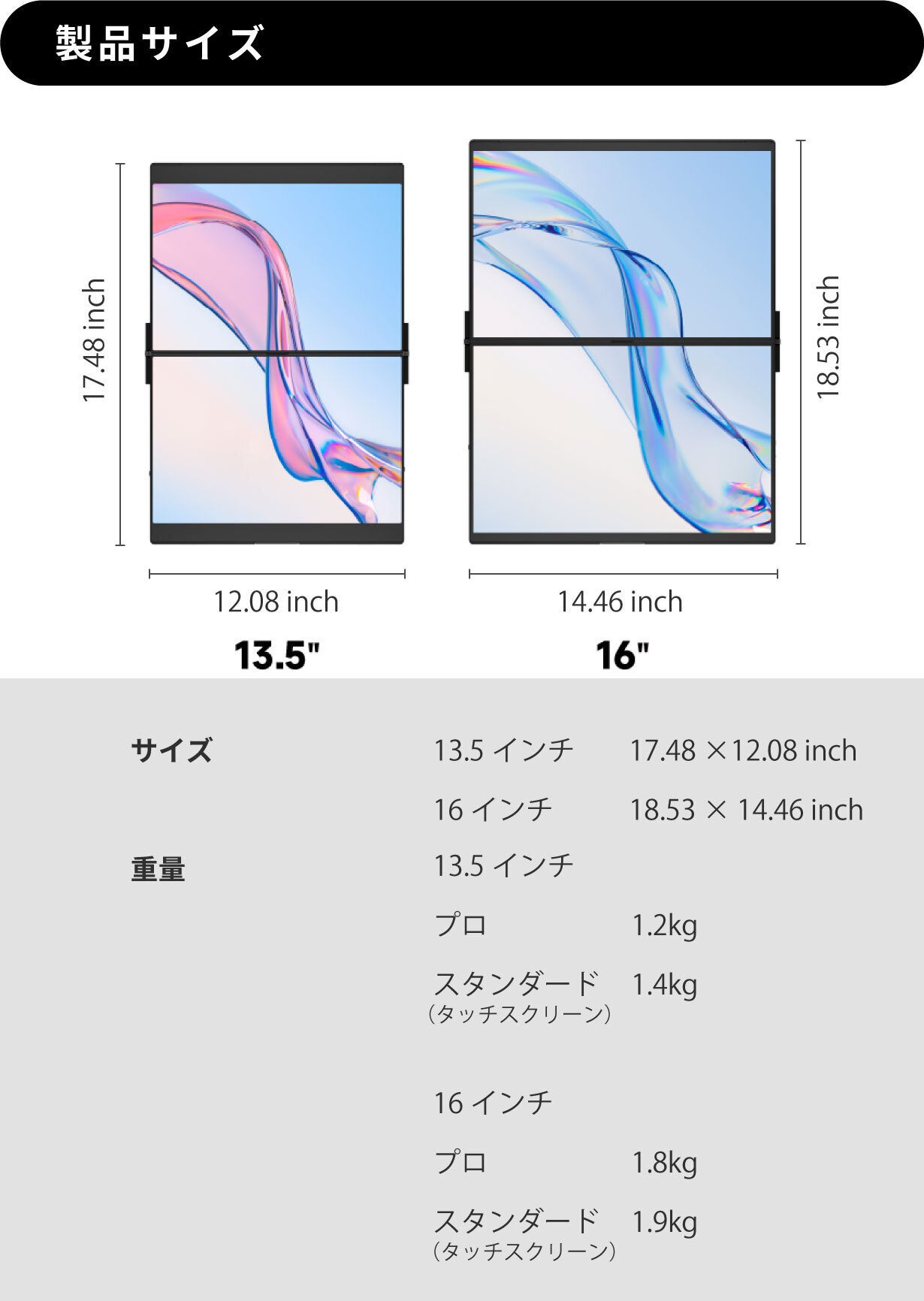 A: 13.5"の重量は約1.4kg、寸法は幅12.08 inch x 高さ17.48 inch x 厚さ16mm(折り畳んだ状態で最も厚い部分)です。 16"の重量は約1.9kg、寸法は幅14.46 inch x 高さ18.53 inch x 厚さ18mm(折り畳んだ状態で最も厚い部分)です。