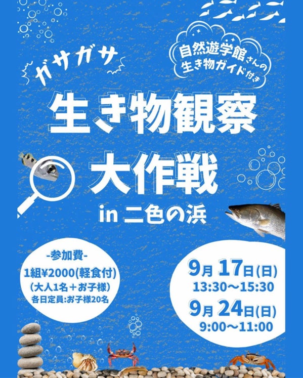 これまでも地域の方々や関連団体と多数のビーチクリーンを実施したり、貝塚市立自然遊学館では環境教育の一環として二色の浜の生態調査イベントを行い、海の状況を観察する等し、きれいな二色の浜であるよう努めてきました。