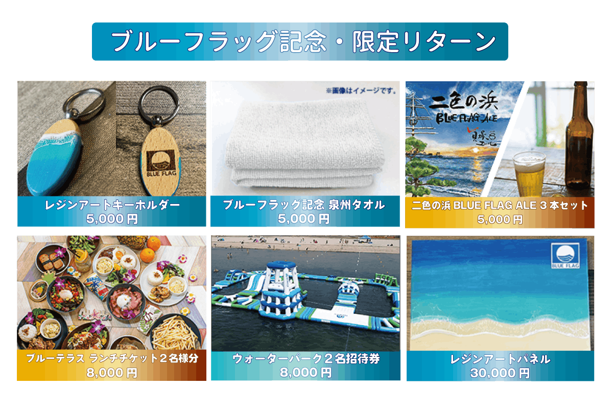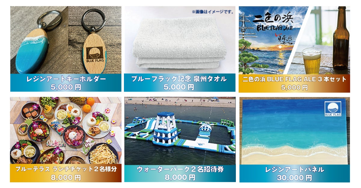 二色の浜をイメージしたデザインのレジンアートキーホルダーやオリジナル泉州タオルやクラフトビールなど今回のブルーフラッグ取得を記念したクラウドファンディング限定リターンを多数ご用意しました!