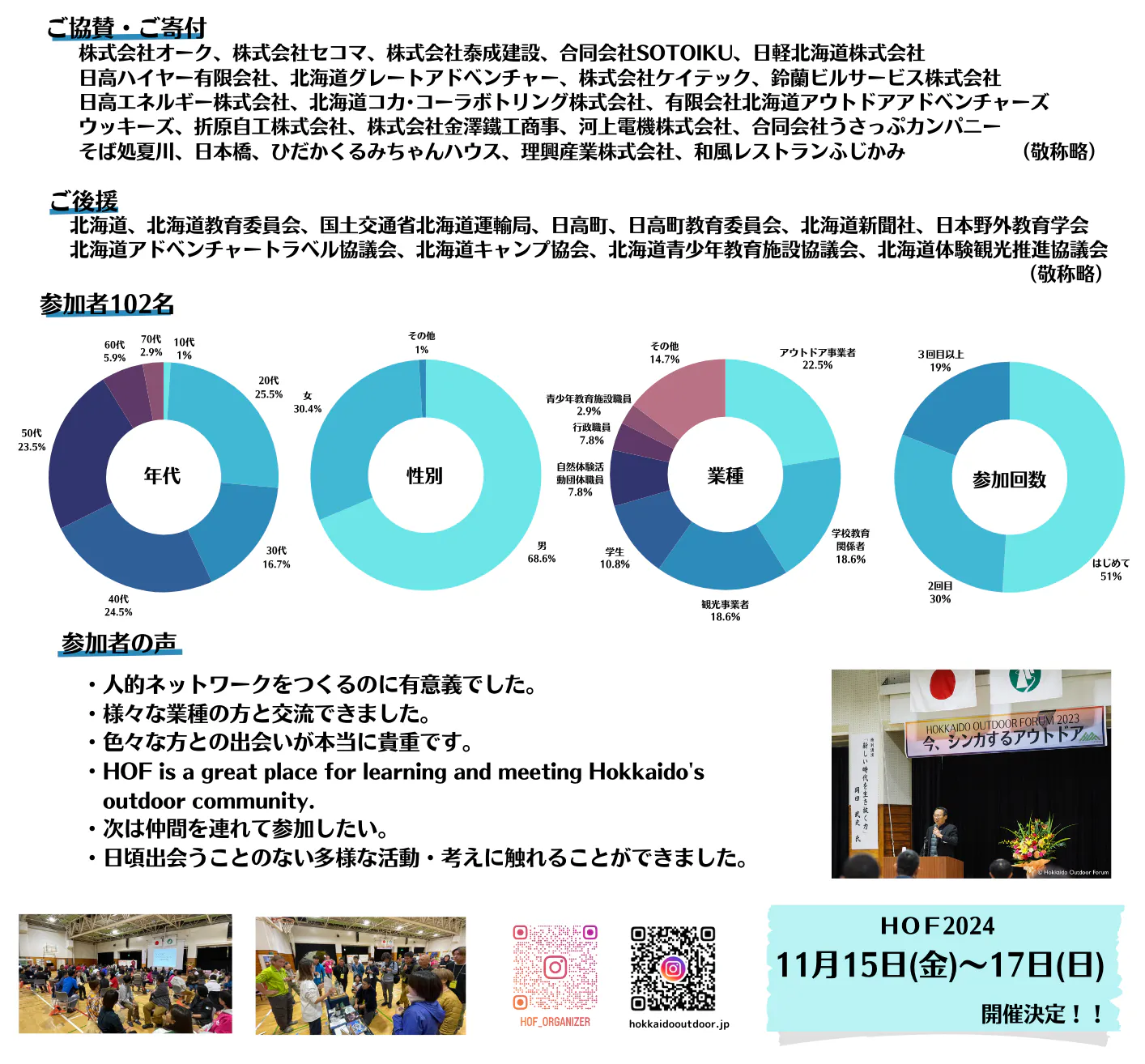今後も、北海道アウトドアに関わる全ての⼈が情報収集や新たなネットワークを構築できる場としてHOFを開催し、アウトドア業界全体を盛り上げ、道内の⼦どもたちの⾃然体験活動の質的・量的向上や地域振興にに貢献していきたいと考えています。