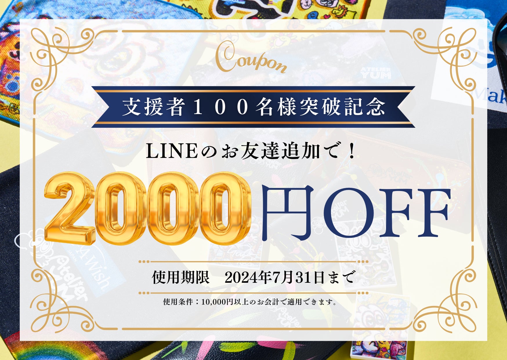 CAMPFIREでの100名様突破記念として、公式LINE「ATELIER YUM」のお友達追加で、7月20日オープンのECサイト「ATELIER YUM」で使える2000円OFFクーポンをプレゼントいたします!