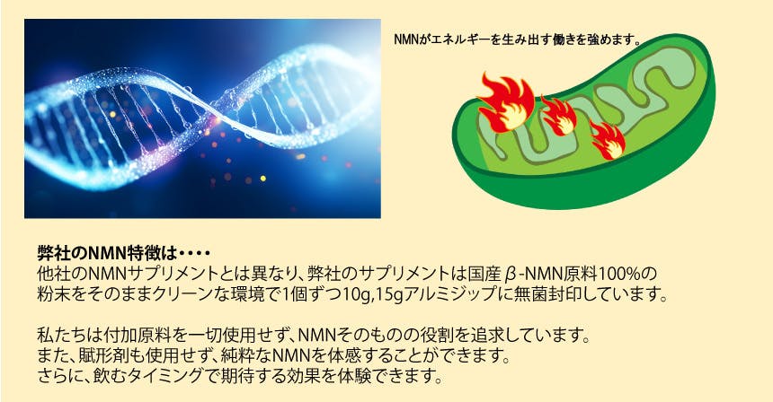 NMNは体内でビタミンB3から合成され老化を抑える長寿遺伝子(サーチュイン遺伝子)を活性化して体の衰えを抑制します。NMNはまたエネルギー生産工場であるミトコンドリアを活性化し細胞を若返らせ健康寿命に貢献します。その結果は体の疲労を抑制して日々の元気を保つ働きをします。いいことづくめのNMNですが加齢に伴って体内での生産が減少します。食品成分でもあるNMNは日常の食事にも含まれてはいますが、加齢による減少分を補うにはNMNそのものをサプリメントとして摂取することで十分な働きが見込めます。