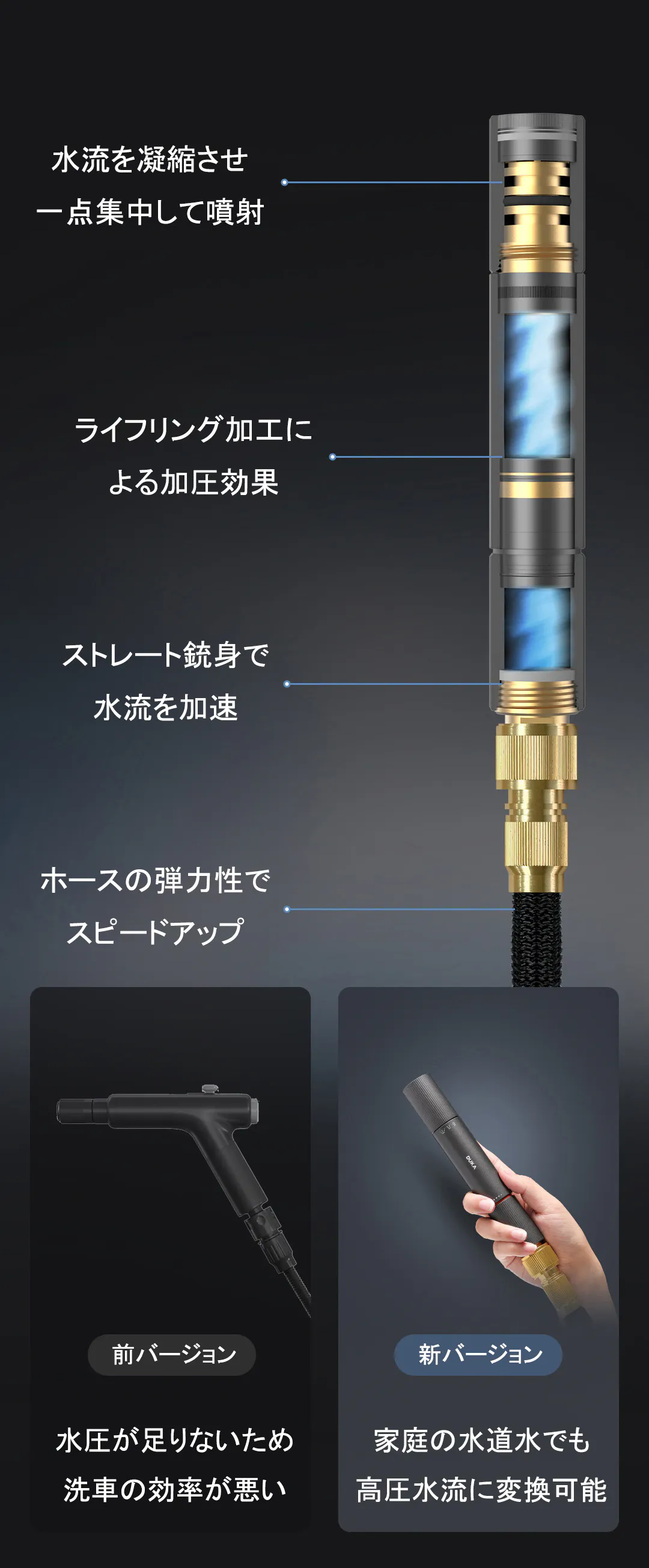 自動加圧構造により、家庭の水道水でパワフルな水圧を実現し、電気を使わずに高い洗浄力を提供します。車体の洗浄、タイヤの隙間についた汚れも簡単に除去できます。