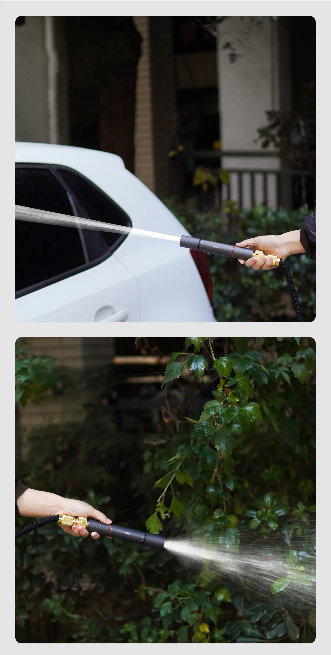 ノズルの後部を回すと、水が放出され、前部を回すだけで簡単に水量を調節できます。