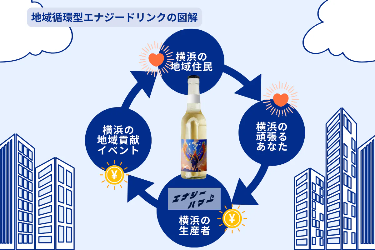 「横浜の特産品を使って横浜の企業で企画し、売上の一部を地域貢献に使う地域循環型のエナジードリンクがあったらいいじゃないか!」