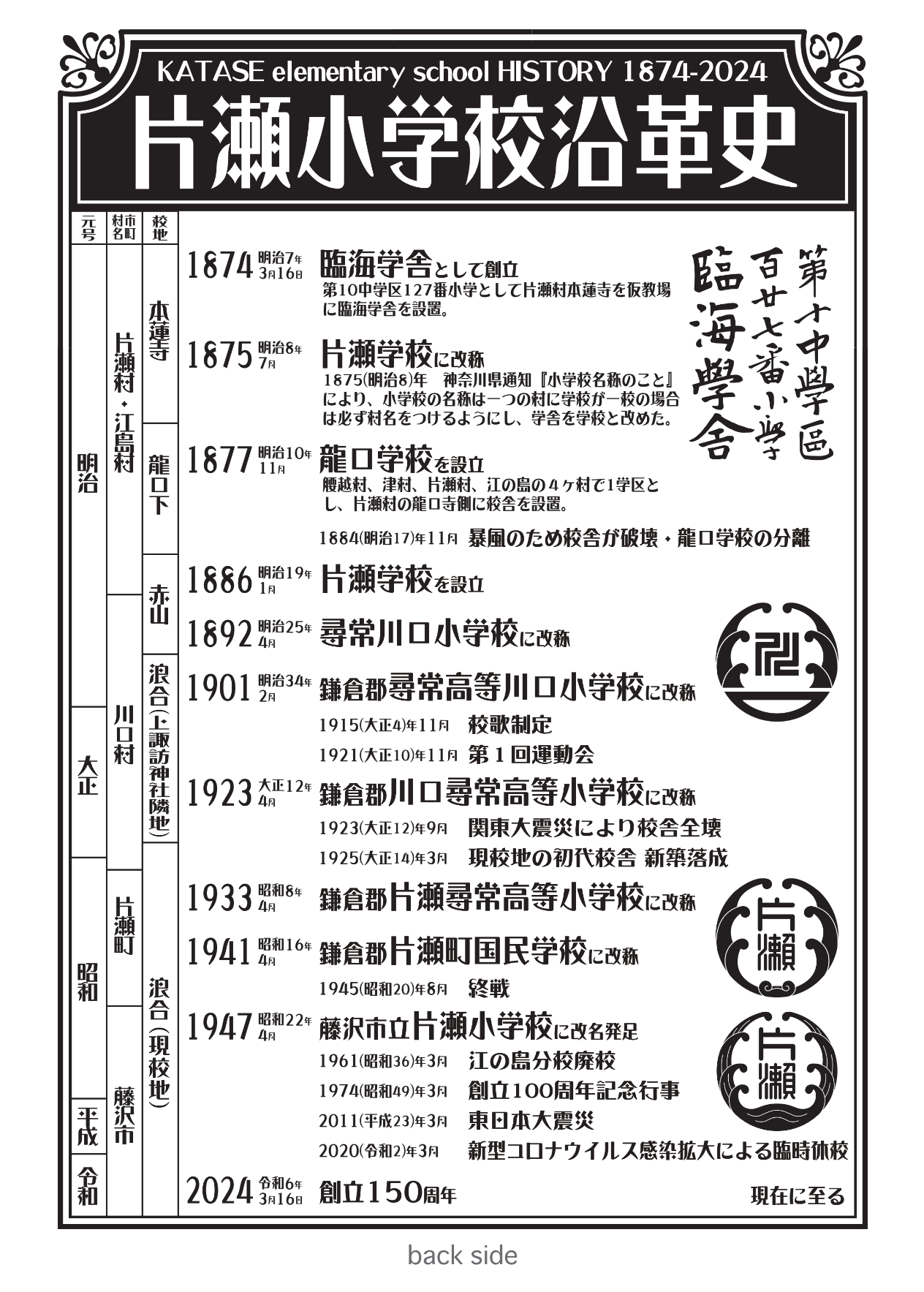 明治7 年(1874 年)、⿓⼝寺輪番⼋ヶ寺の本蓮寺(現在の神奈川県藤沢市⽚瀬3 丁⽬)に創⽴された臨海学舎が、幾度の名称変更を経て藤沢市⽴⽚瀬⼩学校となり、令和6 年(2024 年)3月に創⽴150 周年を迎えました。