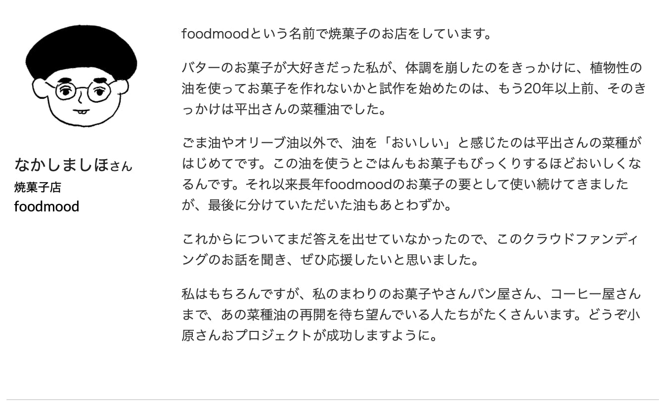 当面、一定数の予約が入れば油を搾るという方式をとる予定です。もちろん、クラウドファンディングを支援していただいた方々には優先的に販売いたしますが、大口需要(一斗缶単位の購入)の事業者の皆様のご希望にお応えできるようになるには、時間がかかると思います。また、販売価格が平出さんの時よりも高くなる可能性が大です。以上の事情をご理解していただいた上で、ご支援いただければ幸いです。