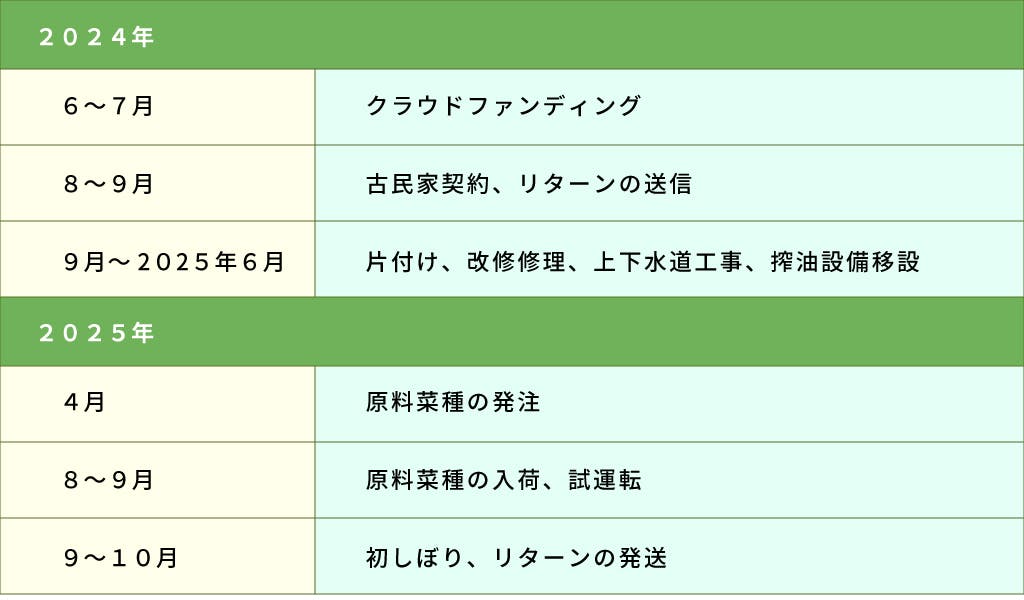 原料菜種の発注時期、収穫時期の関係で、プロジェクトが順調に進んでも、2025年の3〜4月に発注(交渉)し確保が決まっても、刈り取り、乾燥調製が終わって入荷するのは8月~9月になることから、年内に施設が完成しても、搾油できるのは来年秋ごろになりそうです。
