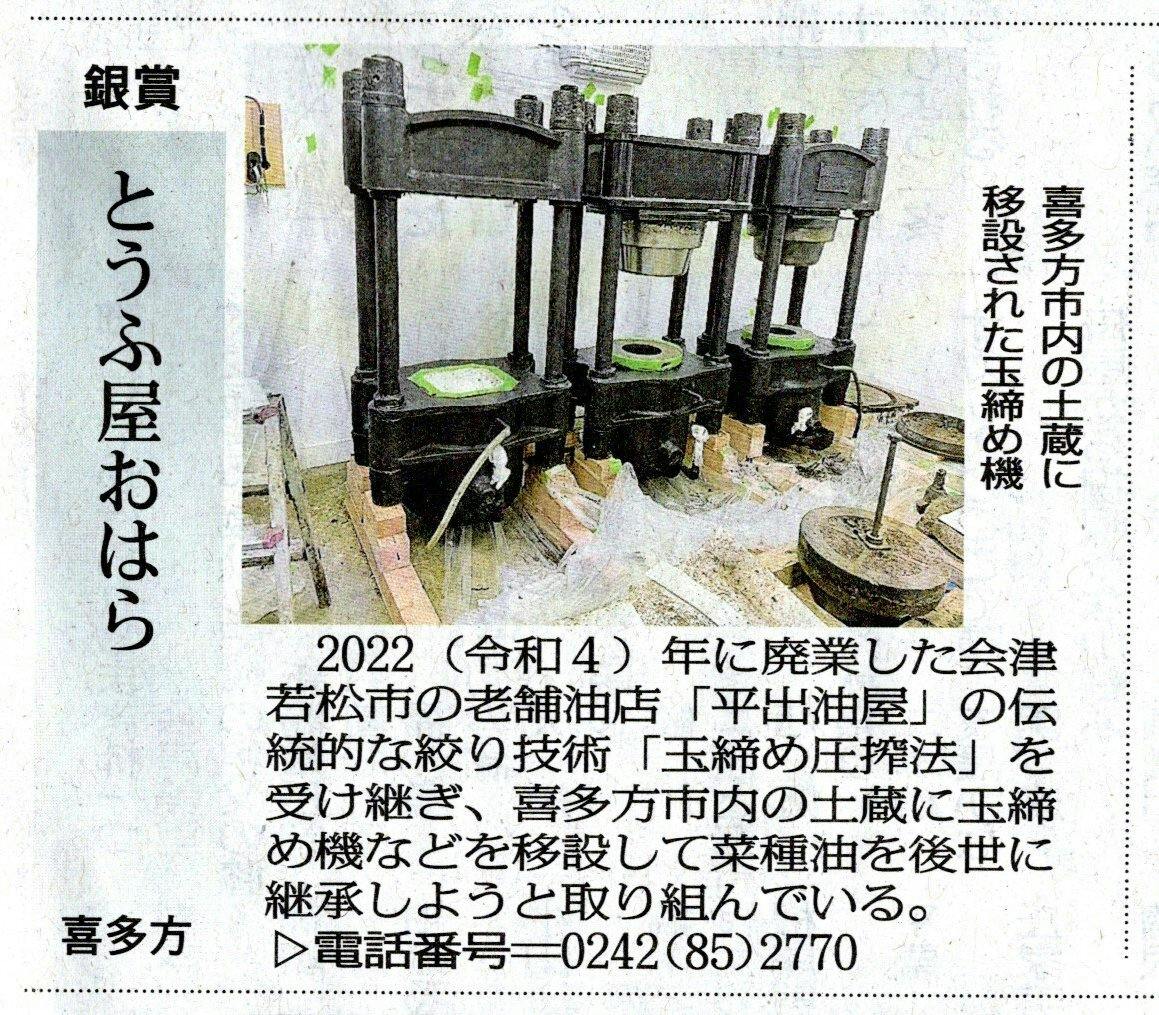 2026/01/27 10:26肋骨骨折の痛みはおさまり、むち打ちや背骨の痛みが残っていますが、筋力をつけるため少しずつリハビリを始めています。筋力トレーニングといっても、ラジオ体操よりも緩いものですが、無理のない程度にやっています。豆腐屋も油屋も早く再開できるよう頑張ります。さて、去る1/21(水)にTUF(テレビユー福島)の情報番組「ステップ」で放映された平出油屋プロジェクトの特集の見逃し配信が見られるようになりました。こちらは全国どこでも視聴できます。TUFの担当者に長期にわたって取材していただき、僕が平出さんに弟子入りして教えてもらっていたときから、クラウドファンディングを経て、移設工事の様子、初めての搾油までがカバーされています。プロジェクトの全体像のわかる貴重な記録にしていただきました。昨年11月までにすべての取材を終えて、当初は11/26に放映される予定でした。ところが僕が11/22に交通事故で入院したため、放映が延期されていたものです。以下のリンクをクリックしてご覧ください。江戸時代からの“菜種油”を未来へ…廃業の老舗から受け継いだ豆腐店の挑戦 福島https://newsdig.tbs.co.jp/articles/-/2425253/2026/1/27記 もっと見る今週1/21(水)TUFで平出油屋プロジェクトが放映されます